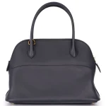 This Hermès inspired Bolide uses Swift Bleu Indigo (deep navy) leather for sleek polish. Gold hardware highlights the structured, vintage inspired shape. The compact size fits tablets, wallets, and essentials. Swift leather stays smooth and scratch resistant. Pair with tailored outfits or denim for nautical contrast. Perfect for offices, travel, or timeless elegance. Retro charm perfected.