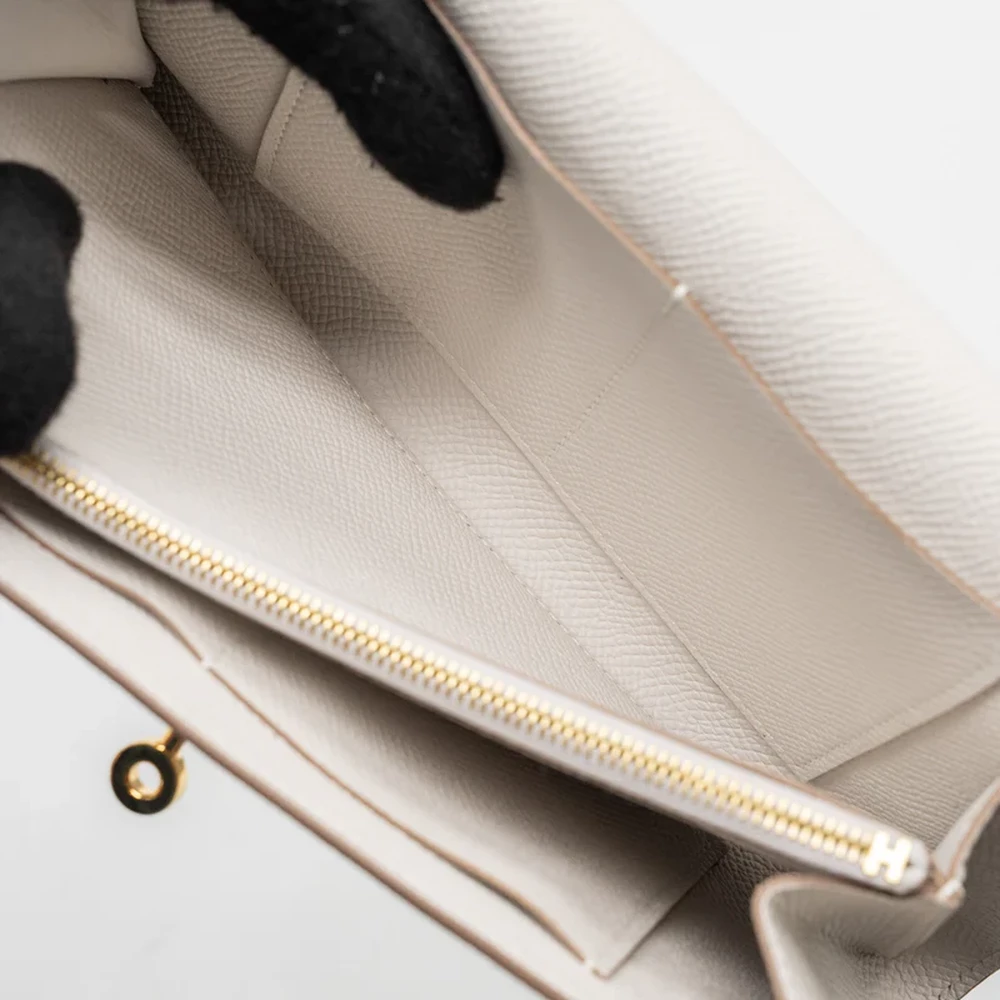 This Hermès Classic Kelly To Go in Epsom leather and Gris Pale with gold hardware offers a soft, neutral color that exudes understated luxury. The calm grey leather combined with the warm gold hardware creates an elegant and sophisticated look, perfect for those who love timeless and versatile luxury.