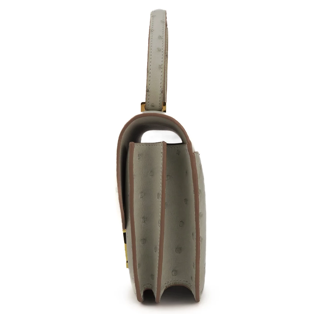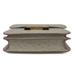 This Hermès Constance 18 uses Gris Perle (pearl grey) ostrich leather for exotic texture. Gold hardware highlights the compact, boxy silhouette. The 18cm size fits keys, cards, and lipsticks. Ostrich leather is lightweight and scratch resistant. Pair with metallics or neutrals for subtle glamour. Ideal for dinners or offices. Understated rarity.