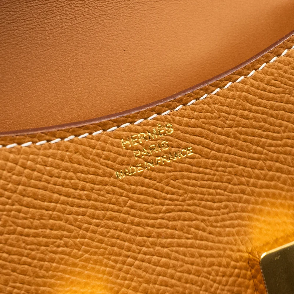 This Hermès Constance Slim in Epsom leather in Gold with Gold Hardware stamp U offers a sleek and timeless design. The rich Gold color, combined with the durable Epsom leather, creates a sophisticated look. Gold hardware adds a luxurious touch to this elegant accessory.