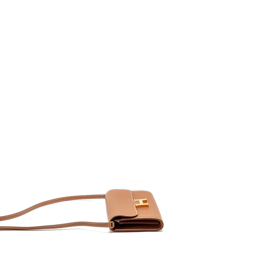 This Hermès Constance To Go in Evercolor leather and Gold with gold hardware offers a sleek, minimalist design. The warm golden leather paired with the luxurious gold hardware creates a timeless, sophisticated look. The practical, slim design makes it a perfect choice for those who appreciate style and functionality.