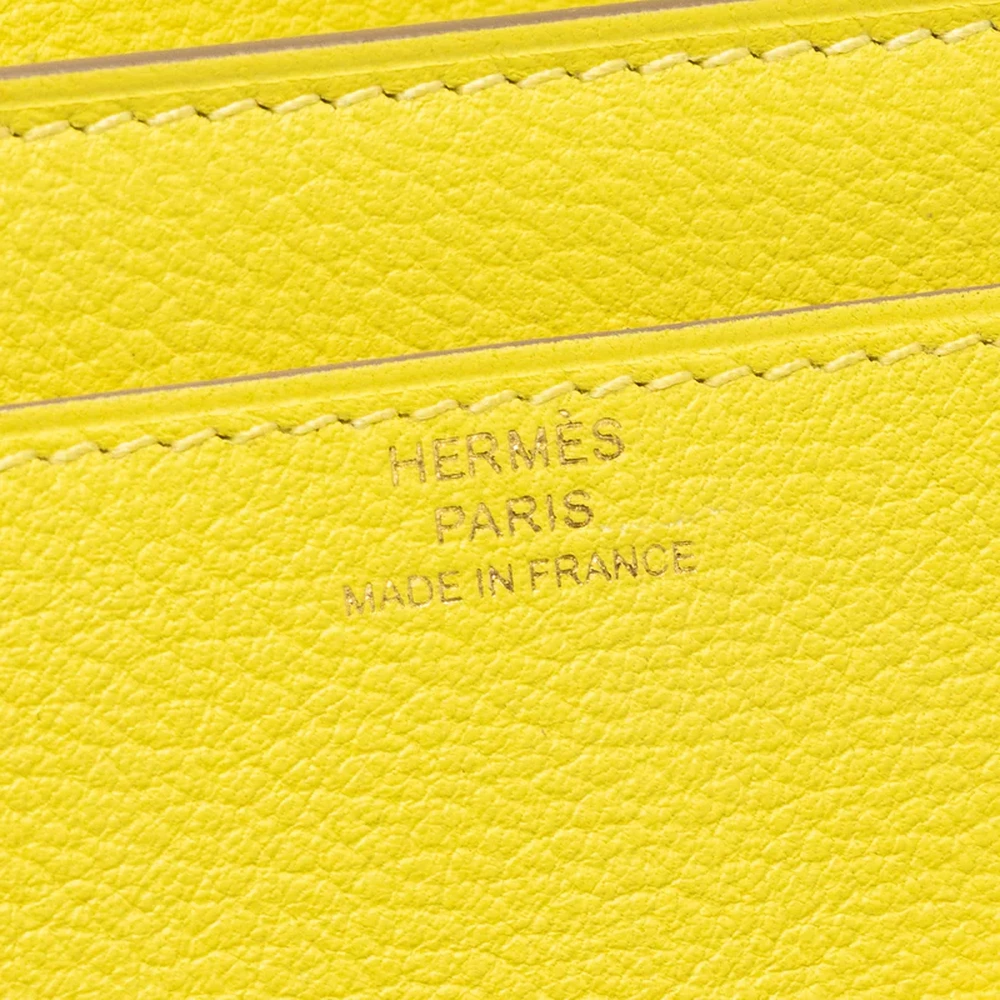 This Hermès Constance to Go in Evercolor leather in Lime with Gold Hardware stamp Z is a bold and vibrant design. The fresh lime hue, combined with the soft Evercolor leather, makes this bag stand out with its bright and lively color. The gold hardware complements the bold design, adding an element of sophistication.