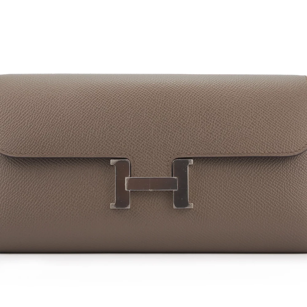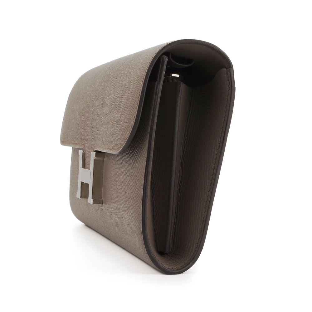 This Hermès Constance To Go uses Togo Gris Etain leather for cool, pewter grey versatility. Palladium hardware accents the crossbody design and functional shape. The compact size fits cards, cash, and small essentials. Togo leather resists scratches and stays lightweight. Pair with tailored coats or casual knits for urban ease. Ideal for errands, travel, or minimalist wardrobes. Effortless polish.