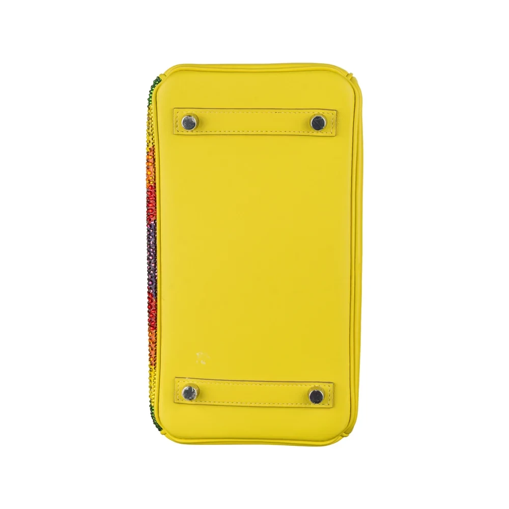 This Hermès style Birkin 25 features a Customized Rainbow Chevron pattern with Swarovski crystals. Palladium hardware balances the 25cm artsy design. Durable materials and crystals resist wear while catching light. Compact yet fits essentials like cards and keys. Pair with neutrals to let the rainbow shine. Perfect for pride events or creative souls. A kaleidoscope of joy.
