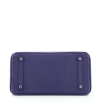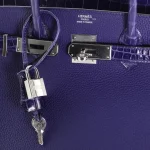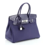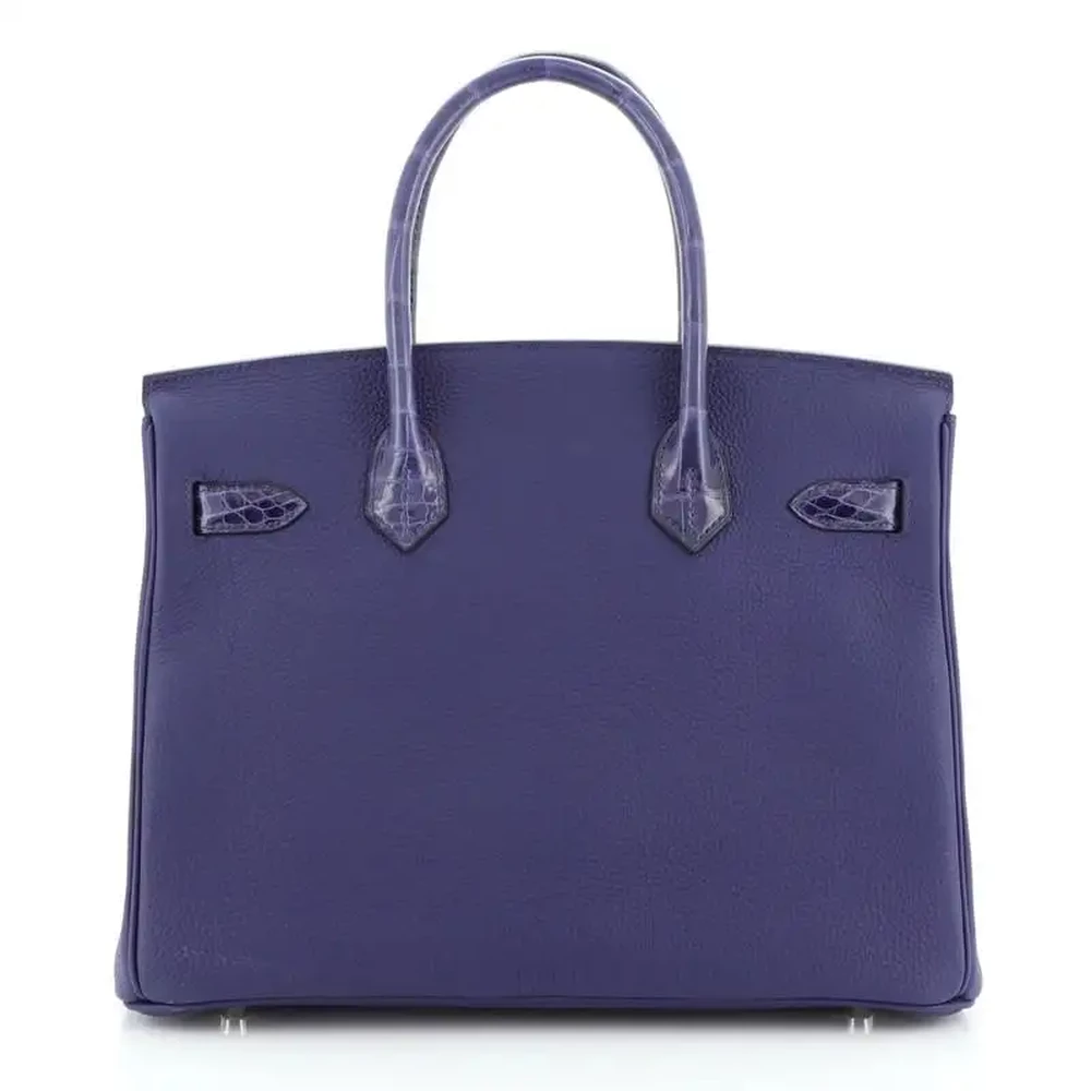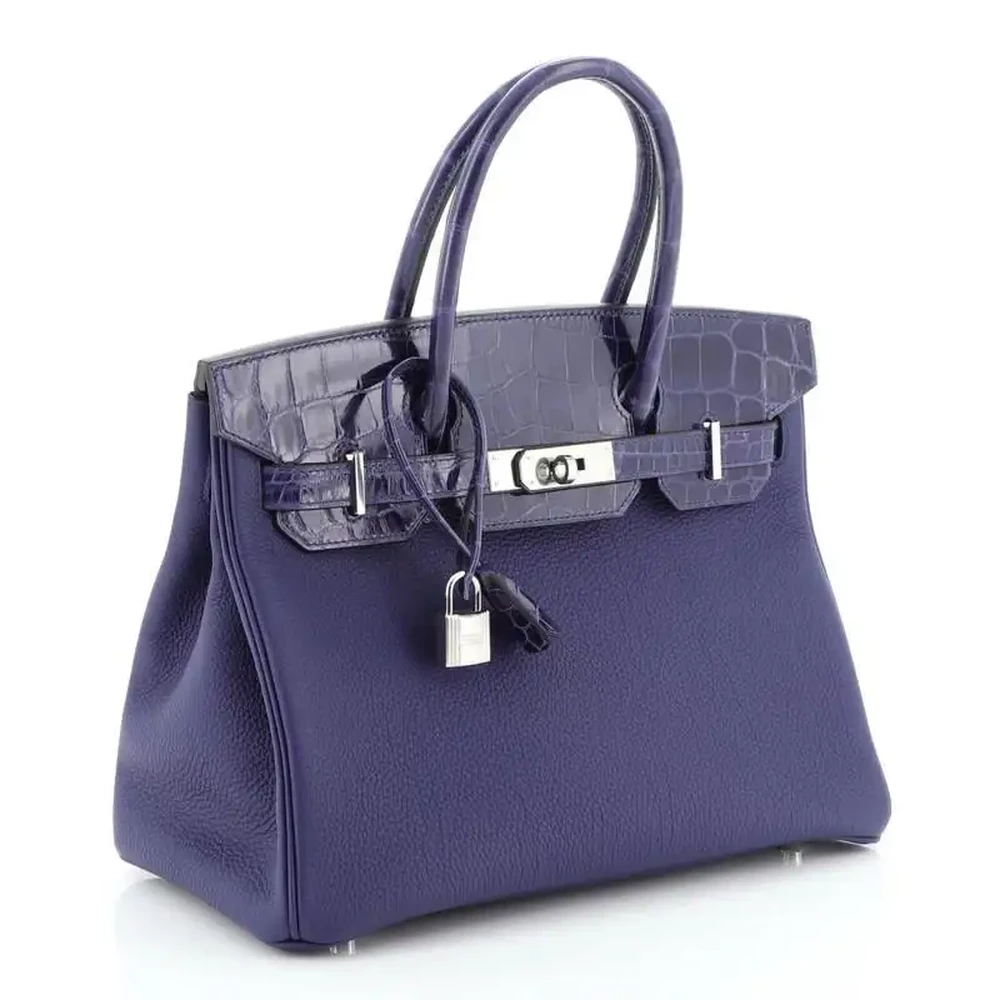 This Hermès inspired Birkin Touch merges inky Bleu Encre Togo leather with glossy Niloticus crocodile. Palladium hardware accents the sleek, functional design. The spacious interior fits tech gadgets, files, or weekend essentials. Togo and croc resist scratches and stay polished. Style with greys or silvers for midnight elegance. Perfect for jetsetters or minimalist wardrobes. Night sky luxury.
