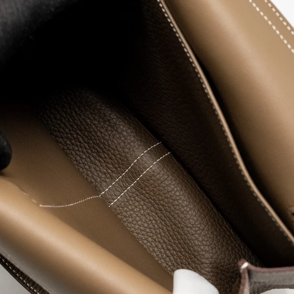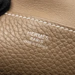 This Hermès Halzan 25 in Clemence leather and Etoupe with silver hardware provides a neutral yet sophisticated color palette. The soft grey brown Clemence leather, paired with the silver hardware, creates a timeless and versatile design. Its compact, structured shape and practical size make it a chic choice for daily use.