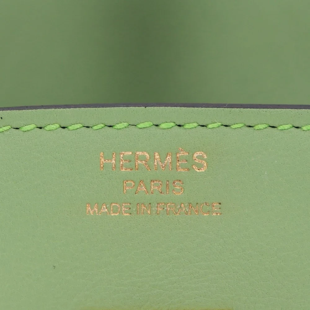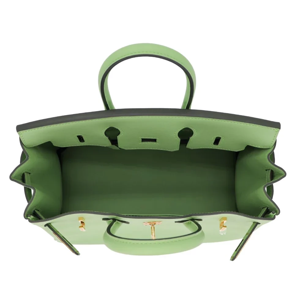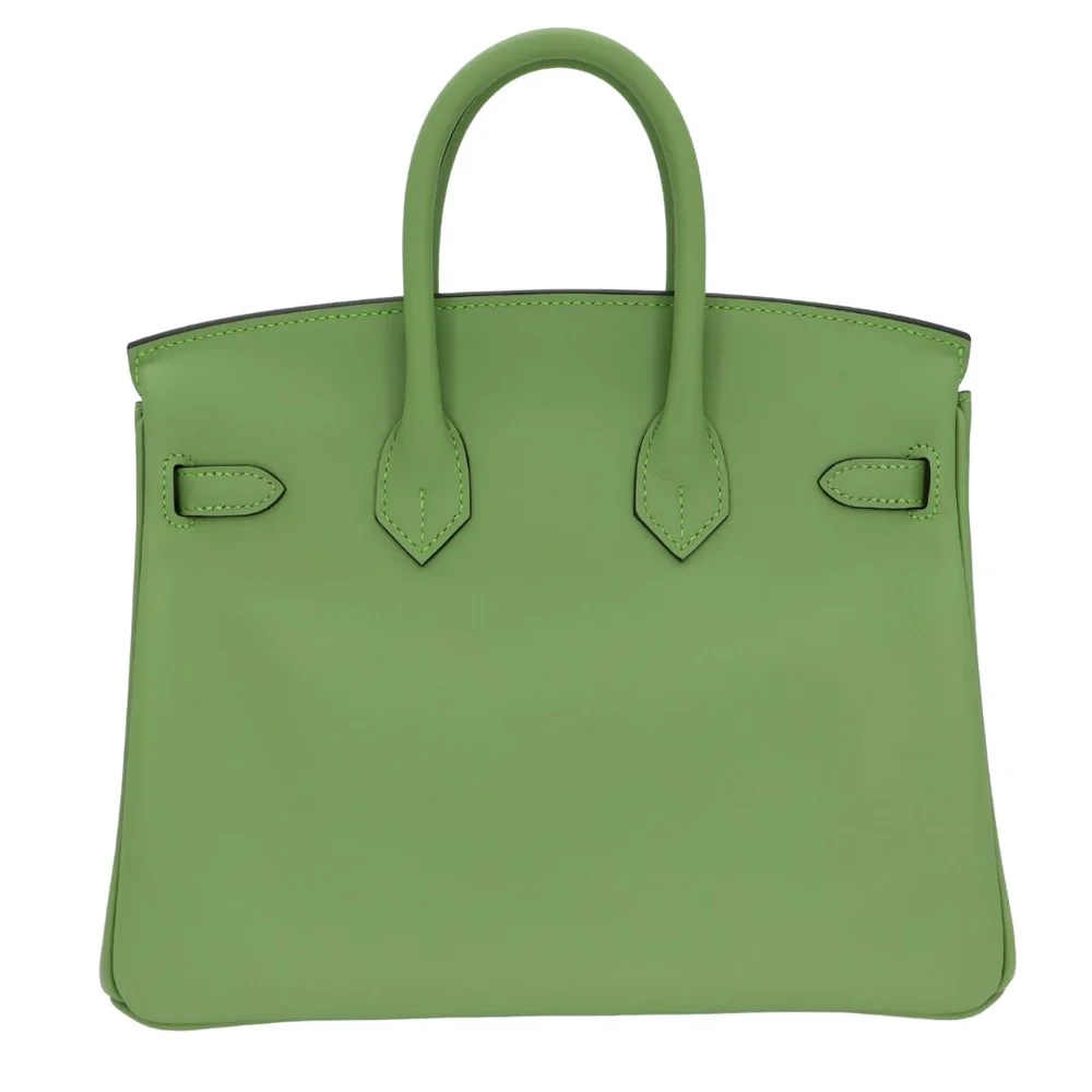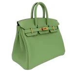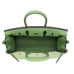 This Hermès inspired Birkin 25 features Vert Criquet Swift leather, a lively grass green tone. Gold hardware amplifies the playful 25cm design. Smooth Swift leather resists scratches and stays buttery soft. Compact yet holds essentials like cards and keys. Pair with neutrals or floral prints for fresh contrast. Lightweight and eye catching for bold fashionistas. Nature’s vibrancy in bag form.