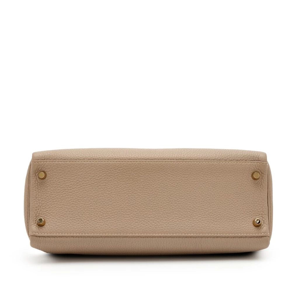 This Hermès inspired Kelly 32 uses Gris Tourterelle Togo leather for cool, neutral sophistication. Palladium hardware accents the slouchy silhouette and top handles. The 32cm spacious design fits work gear, snacks, and travel items. Togo leather masks minor marks and stays lightweight. Style with monochromes or jewel tones for modern contrast. Built for urban life, travel, or minimalist chic. Serene practicality.