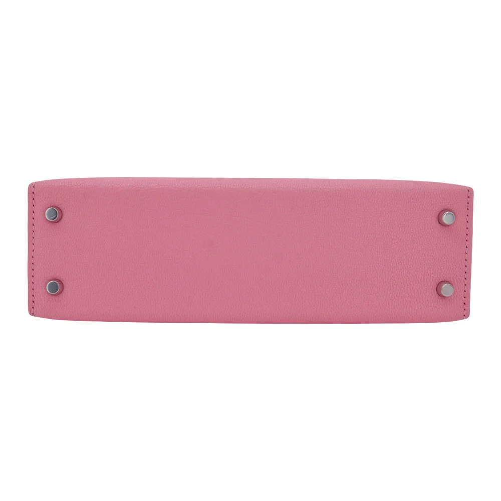 This Hermès inspired Kelly Mini uses Rose Confetti chèvre. Palladium hardware cools the candy pink tone. The 20cm sellier style holds essentials neatly. Soft leather feels luxurious against skin. Brightens neutral outfits instantly. Perfect for birthdays or daytime events. Sweet luxury for happy moments.
