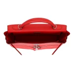 This Hermès Inspired 32cm Kelly features Vermillon leather in bright red. Palladium hardware cools down the warm tone. The retourne style offers relaxed elegance. Roomy size fits work essentials comfortably. Makes a statement with neutral outfits. Your perfect power bag for professionals. Confident luxury for leaders.