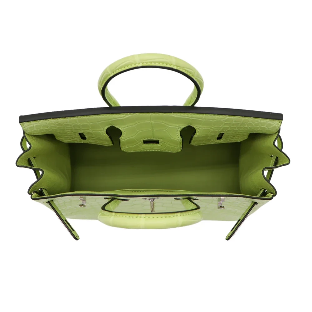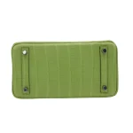 This Hermès style Birkin 25 in Jaune Bourgeon uses sunny yellow matte alligator leather. The silver palladium hardware keeps the look fresh and modern. The 25cm size is compact but holds your phone and cards. The bright color adds a pop of joy to any outfit. Carry it on rainy days to chase away the gloom. It’s a little burst of happiness on your arm.