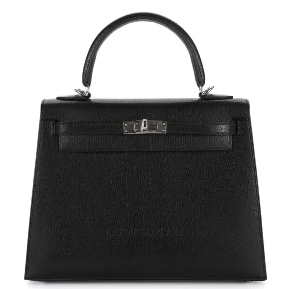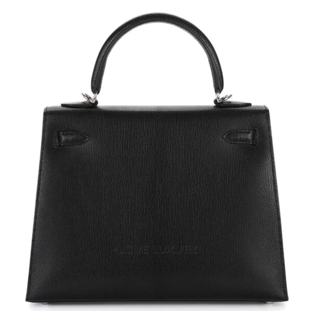 This Hermès inspired Kelly 25 features Black Chèvre Chamkila leather for glossy, edgy polish. Palladium hardware complements the sharp Sellier lines. The 25cm size fits laptops, cosmetics, and essentials. Chèvre leather stays lightweight and durable. Style with leather pants or evening wear for rebellious contrast. Built for nights out or bold office looks. Sleek audacity.