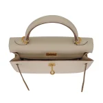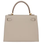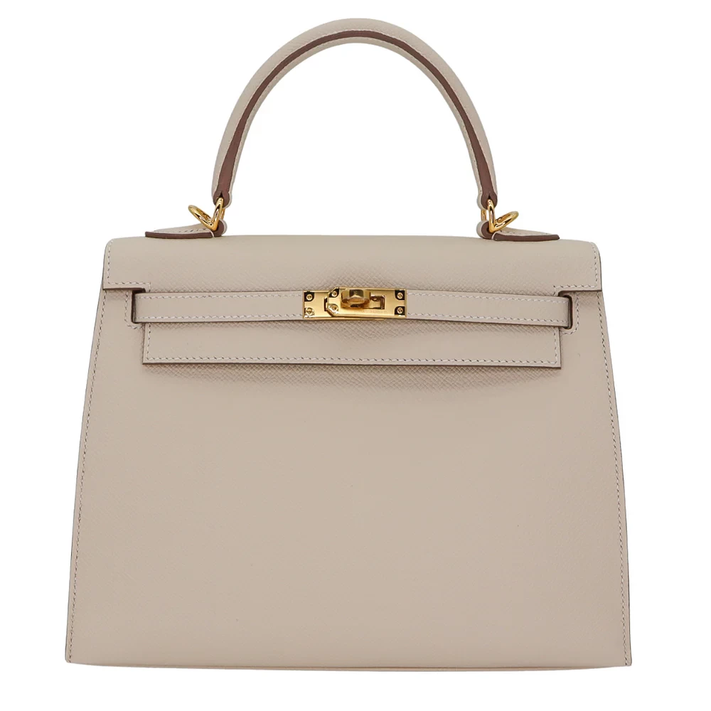 This Hermès inspired Kelly 25 Sellier features Craie Epsom leather for soft, neutral minimalism. Gold hardware accents the crisp Sellier stitching and structured shape. The 25cm size fits laptops, planners, and essentials. Epsom leather stays scratch resistant and polished. Pair with pastels or earth tones for understated elegance. Ideal for offices, travel, or timeless wardrobes. Quiet sophistication.