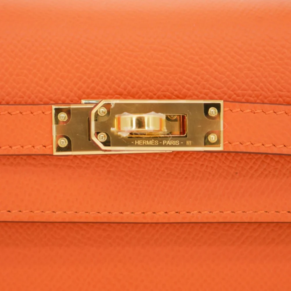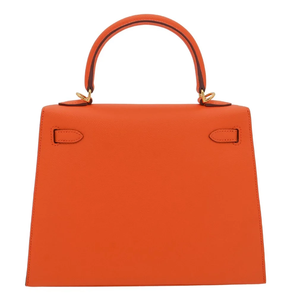 This Hermès style Kelly 25 shines in Orange Epsom leather. Gold hardware amplifies the vibrant citrus tone. The 25cm sellier design keeps essentials organized. Durable Epsom resists scratches and fading. Brightens neutral summer outfits instantly. Perfect for vacations or weekend adventures. Bold color for confident personalities.