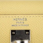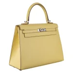 This Hermès style Kelly 25 features Jaune Poussin Epsom in soft yellow. Palladium hardware cools the cheerful hue. The sellier design stays structured and lightweight. Stain resistant leather stays bright for seasons. Perfect with pastels or white for spring freshness. Your ideal brunch or garden party companion. Sunny luxury in petite form.