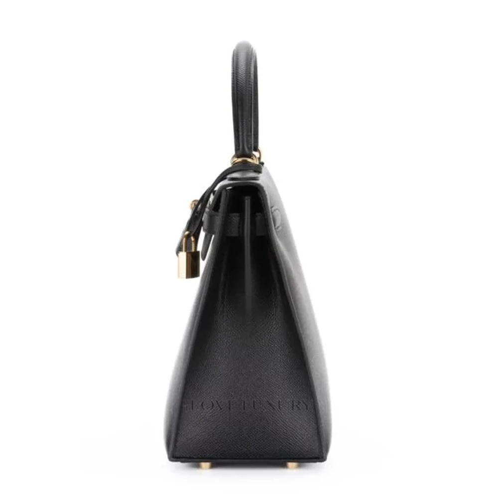 This Hermès inspired Kelly 28 Sellier uses Epsom Black leather for sharp, structured polish. Gold hardware accents the angular lines and clasp. The 28cm size fits laptops, files, and essentials. Epsom leather stays scratch resistant and stiff. Pair with monochromes or metallics for timeless contrast. Perfect for offices, events, or minimalist wardrobes. Sleek authority.