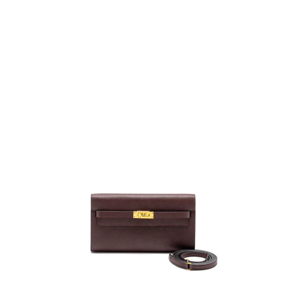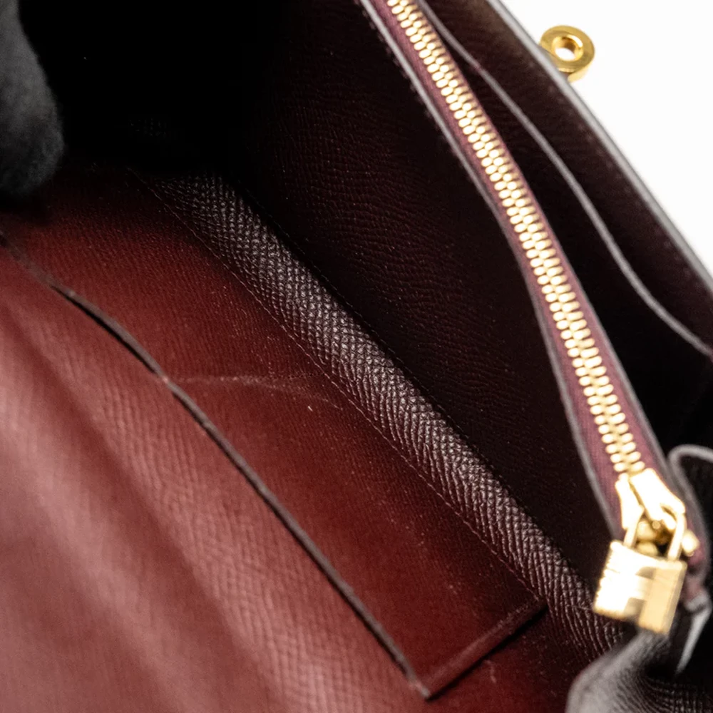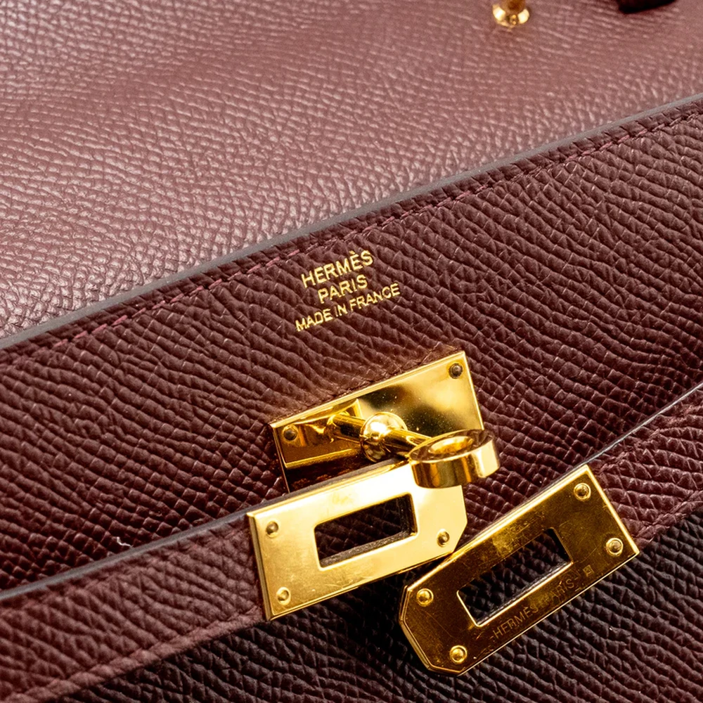 This Hermès Kelly To Go in Dark Red with Gold Hardware stamp B is a sophisticated design with a rich, deep red hue. The dark red leather is complemented by the gold hardware, which adds a touch of warmth and elegance. Perfect for both formal and casual settings, this bag exudes timeless style.