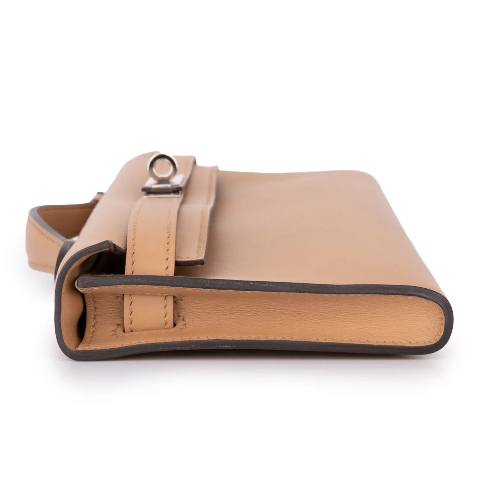 This Hermès Kelly Cut uses Swift Biscuit leather for creamy, neutral simplicity. Palladium hardware accents the slim, blade like silhouette. The compact size fits cards, cash, and lipsticks discreetly. Swift leather stays smooth and lightweight. Pair with earth tones or metallics for understated elegance. Ideal for minimalist wardrobes, travel, or daytime polish. Quiet refinement.