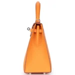 This Hermès inspired Kelly 25 shines in Epsom Orange leather for fiery, head turning vibrancy. Palladium hardware cools the structured Sellier design. The 25cm size fits laptops, planners, and essentials. Epsom leather stays scratch resistant and polished. Style with neutrals or denim for bold contrast. Perfect for parties, travel, or confident errands. Daring luminosity.