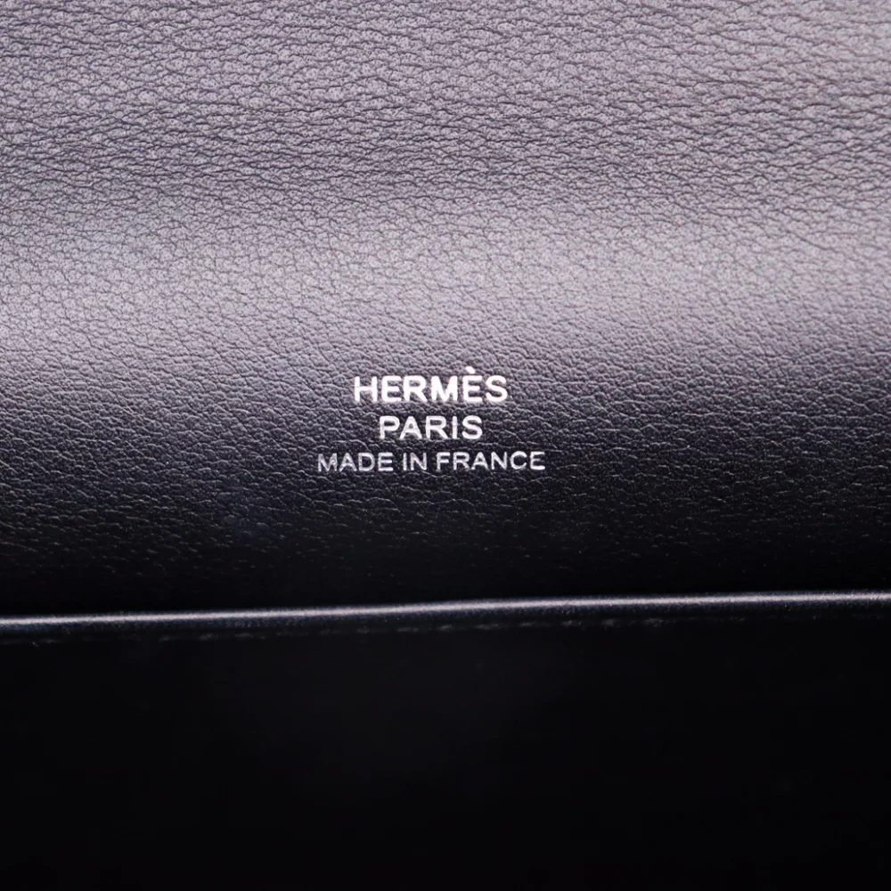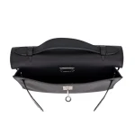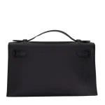 This Hermès style Kelly Pochette features Black Swift leather. Palladium hardware adds modern silver contrast. The 18cm size fits cards, cash, and lipstick. Smooth leather resists light scuffs. Elevates little black dresses instantly. Sleek minimalism for evening elegance.