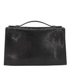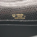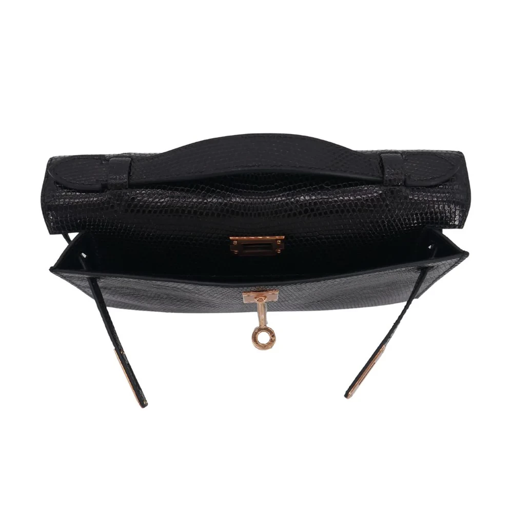 This Hermès inspired Kelly Pochette uses Black shiny lizard leather. Rough gold hardware adds rustic meets luxe contrast. The 18cm clutch features exotic scaled texture. Glossy finish resists wear while catching light. Elevates little black dresses with edge. Perfect for date nights or art gallery events. Unconventional luxury for daring tastes.