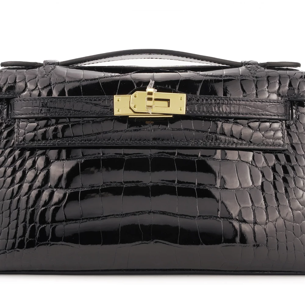 Hermès Kelly Pochette Shiny Black Alligator/Croc Gold HW