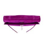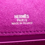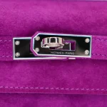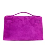 This Hermès Dupe Kelly Pochette features electric Ultraviolet suede in bold purple. Palladium hardware gives a cool modern contrast to the vibrant hue. The small size keeps evening essentials secure while making a statement. Luxurious doblish treatment creates a unique matte velvety finish. The rich color pops dramatically against neutral and black outfits. Perfect for adding unexpected flair to little black dresses. Surprisingly versatile despite its bold color. Your perfect night out companion for those who dare to stand out. Vibrant luxury for fashion risk takers.