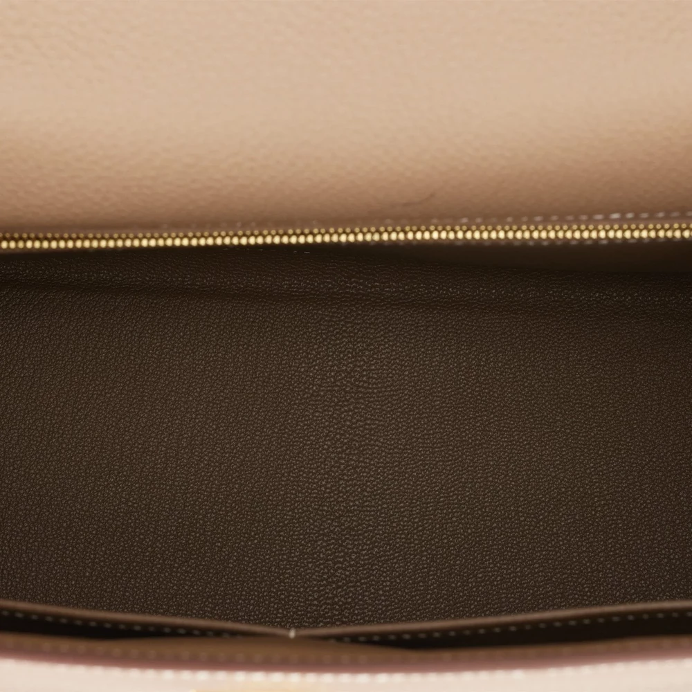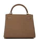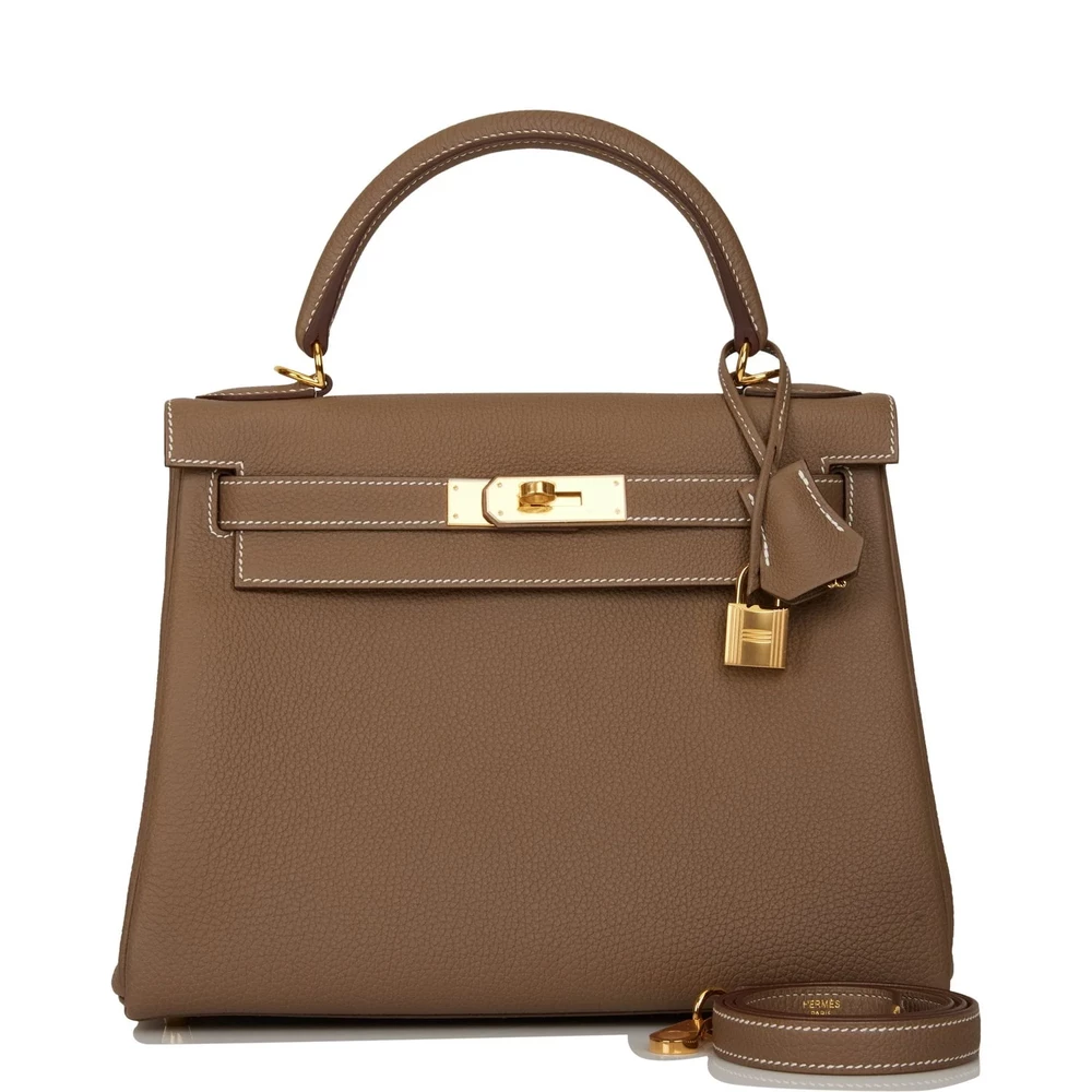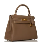 This Hermès style Kelly 28 features Etoupe Togo leather in cool grey brown. Gold hardware adds warmth to the neutral tone. The 28cm retourne design fits work essentials comfortably. Scratch resistant leather hides daily wear. Pairs effortlessly with casual or formal outfits. Your perfect everyday companion for minimalist wardrobes. Understated luxury for practical lifestyles.