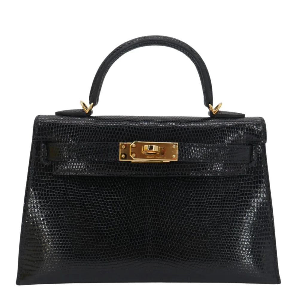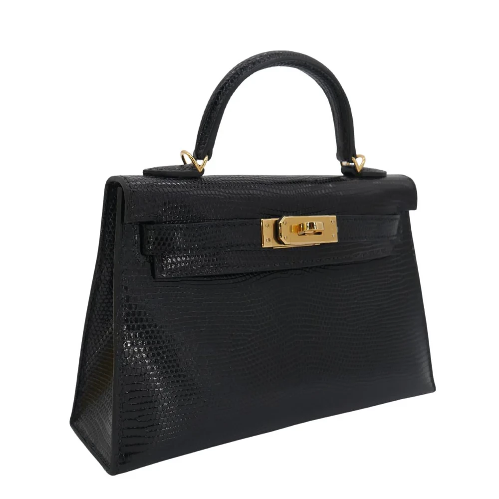 This Hermès style Kelly Mini uses Black shiny lizard leather. Gold hardware elevates the glossy finish. The 20cm sellier style stays structured and sleek. Exotic texture adds intrigue to minimalist looks. Perfect for adding edge to evening wear. Your go to clutch for modern sophistication. Sleek mystery in every detail.