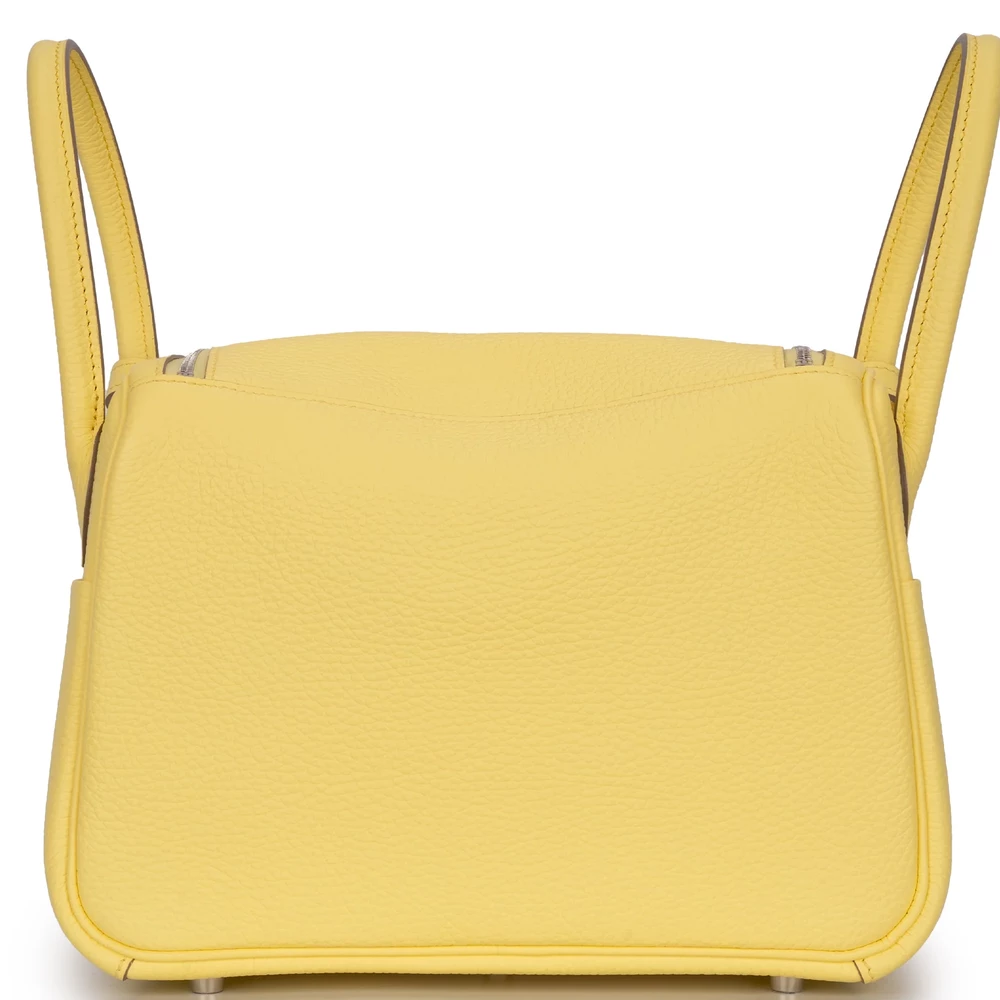 This Hermès Lindy 26 glows in Clemence Limoncello leather for zesty lemon yellow freshness. Palladium hardware accents the slouchy hobo shape and top handles. The 26cm size holds tablets, cosmetics, and essentials. Clemence leather softens over time and resists wear. Pair with white outfits or denim for summer pop. Perfect for vacations, markets, or cheerful errands. Sunshine in motion.