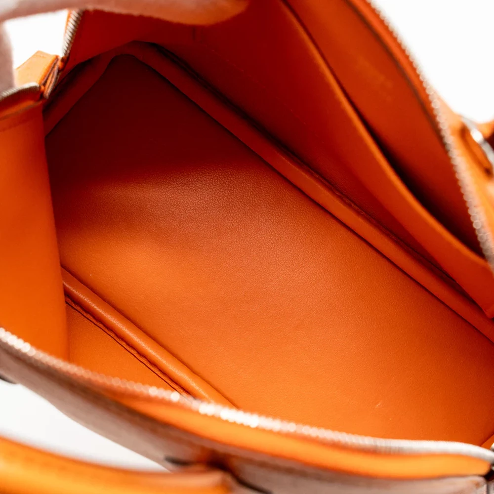 This Hermès Mini Bolide in Chevre Mysore leather and Orange with silver hardware offers a bold and vibrant look. The rich, textured leather and the bright orange color create a fun yet elegant design, while the silver hardware adds a touch of modern sophistication. This bag’s compact size makes it a great statement piece for any outfit.