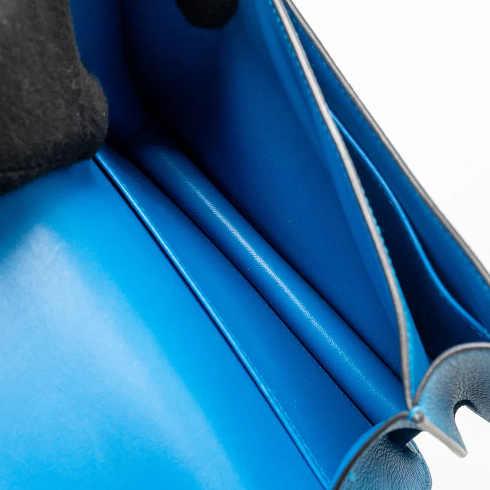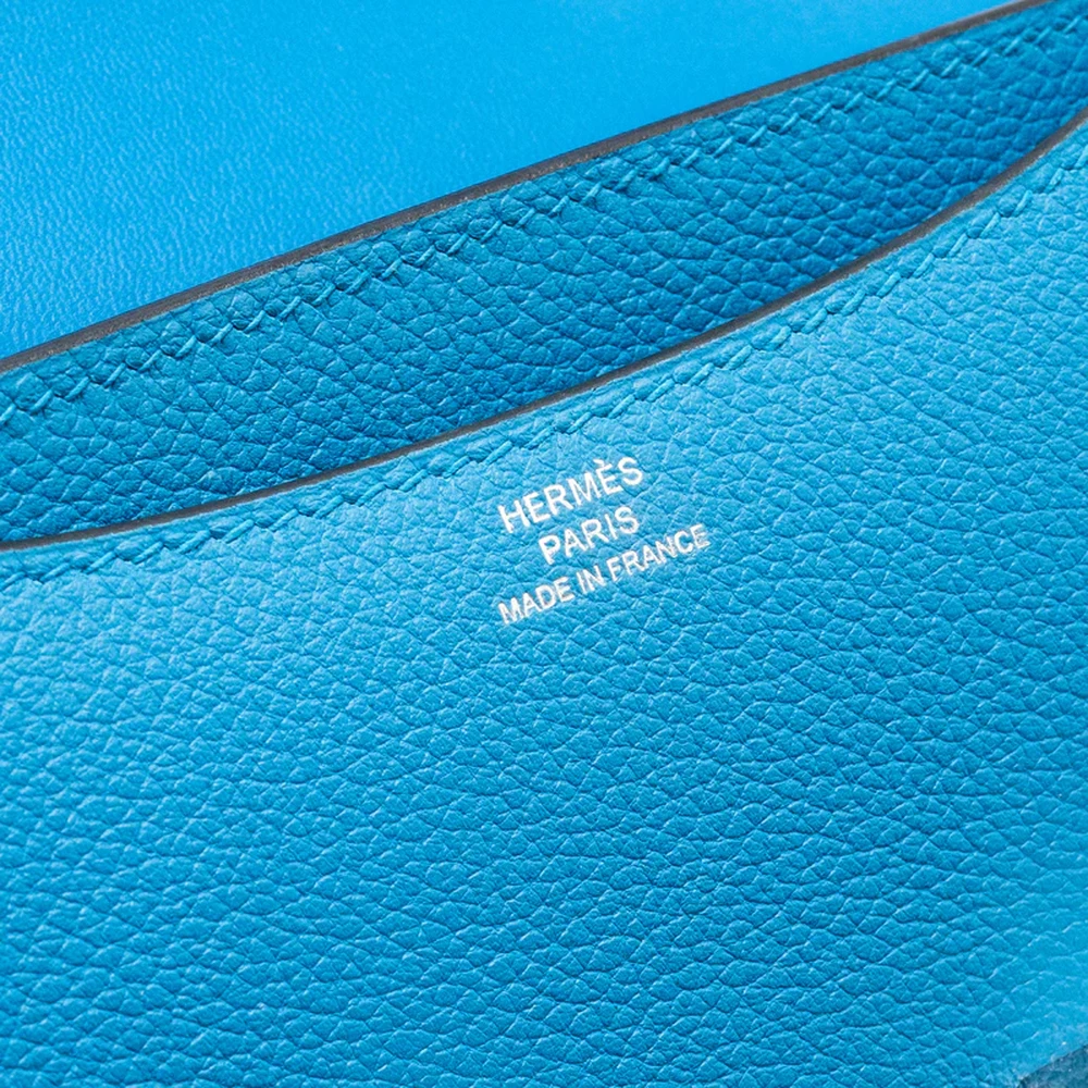 This Hermès Mini Constance in Evercolor leather and Bleu Zanzibar with silver hardware offers a chic and sophisticated design. The rich blue leather paired with the silver hardware creates an elegant and timeless look. Its compact size and structured silhouette make it perfect for both formal and casual events, offering versatility and style.