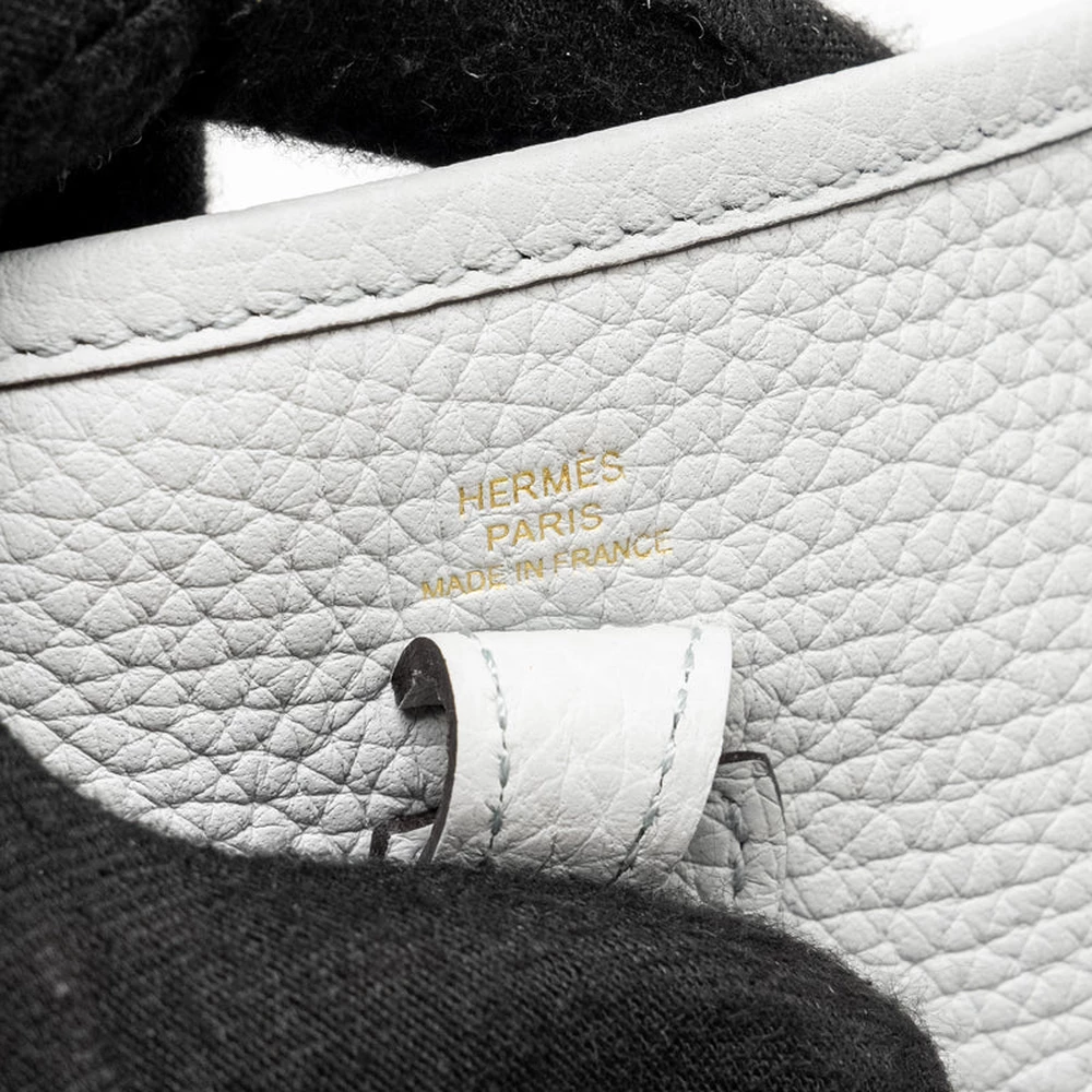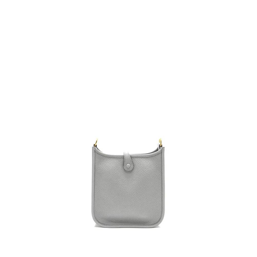 This Hermès Mini Evelyne in Clemence leather in Bleu Pale and Gris Etain with Gold Hardware stamp W offers a soft and sophisticated design. The combination of Bleu Pale and Gris Etain creates a subtle yet striking contrast, while Gold hardware enhances the timeless elegance of this compact bag.