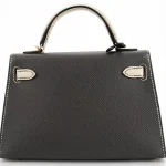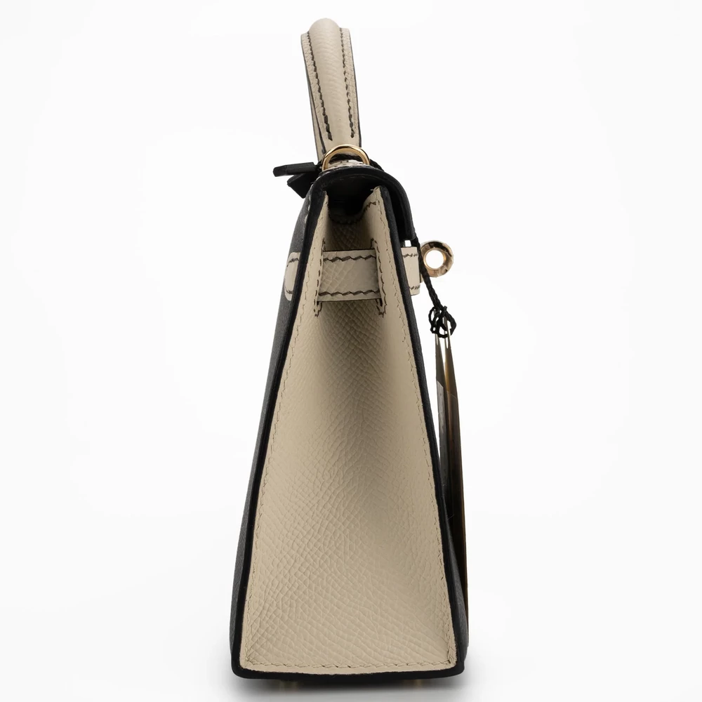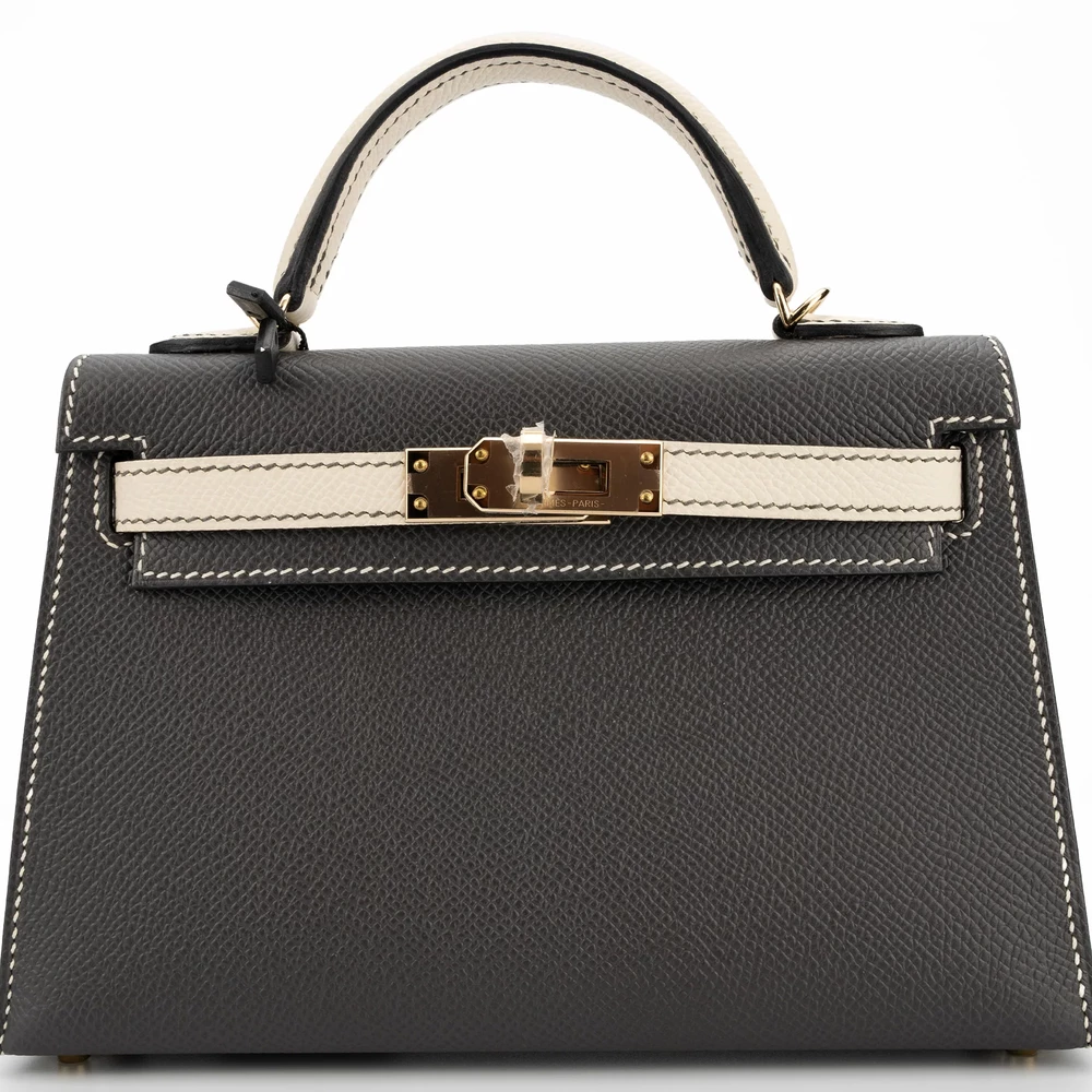 This Hermès Mini Kelly blends Craie (white) and Graphite Epsom leathers for sleek contrast. Permabrass hardware adds vintage charm. The mini size fits cards, keys, and tiny essentials. Durable Epsom leather resists wear. Pair with black outfits or metallic accents for sharp style. Built for evenings or modern looks. Timeless with a twist.