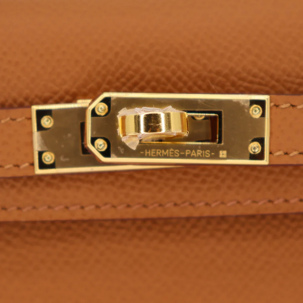 This Hermès style Kelly Mini combines Gold/Black Epsom leather. Gold hardware amplifies the metallic contrast. The 20cm sellier style stays structured. Stain resistant leather maintains sharpness. Perfect for elevating monochrome outfits. Your perfect night out companion with edge.