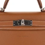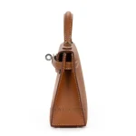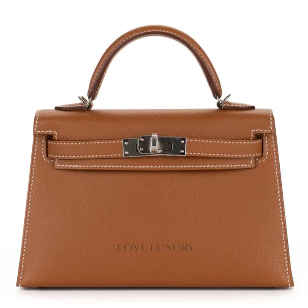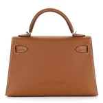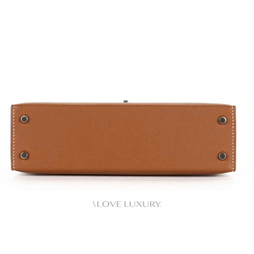 This Hermès Mini Kelly features radiant Gold Epsom leather for sunny sophistication. Palladium hardware cools the warm tone. The mini size fits lipsticks, cards, and tiny essentials. Epsom leather resists scratches and stays crisp. Pair with neutrals or summer dresses for glowing charm. Ideal for brunches or vacations. Sunshine in a bag.