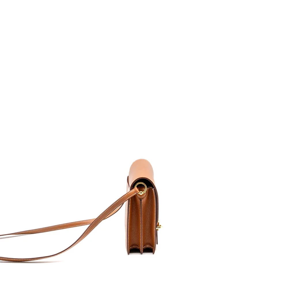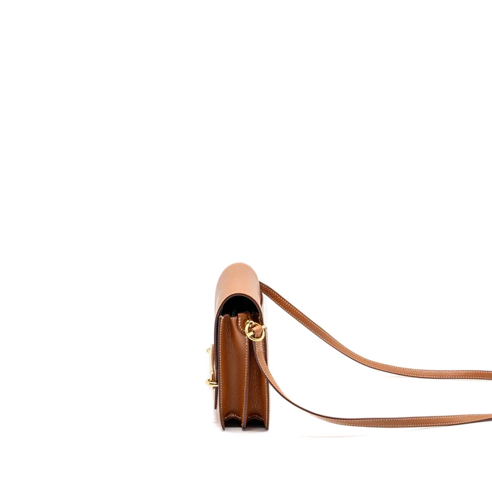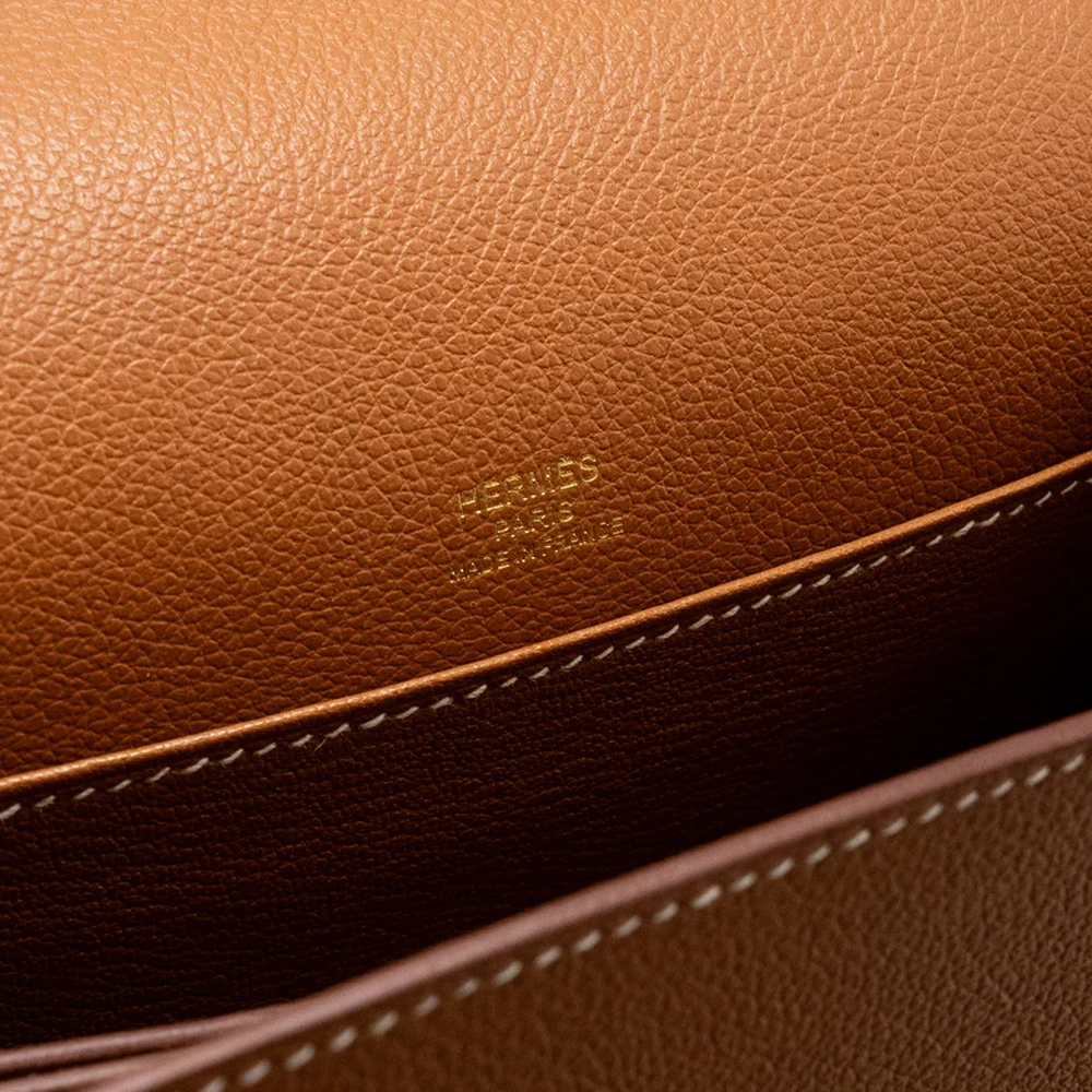 This Hermès Mini Roulis in Evercolor leather and Gold with gold hardware offers a luxurious and refined design. The rich gold leather paired with the warm gold hardware creates a sophisticated, elegant look, while the compact size makes it ideal for both day and night.