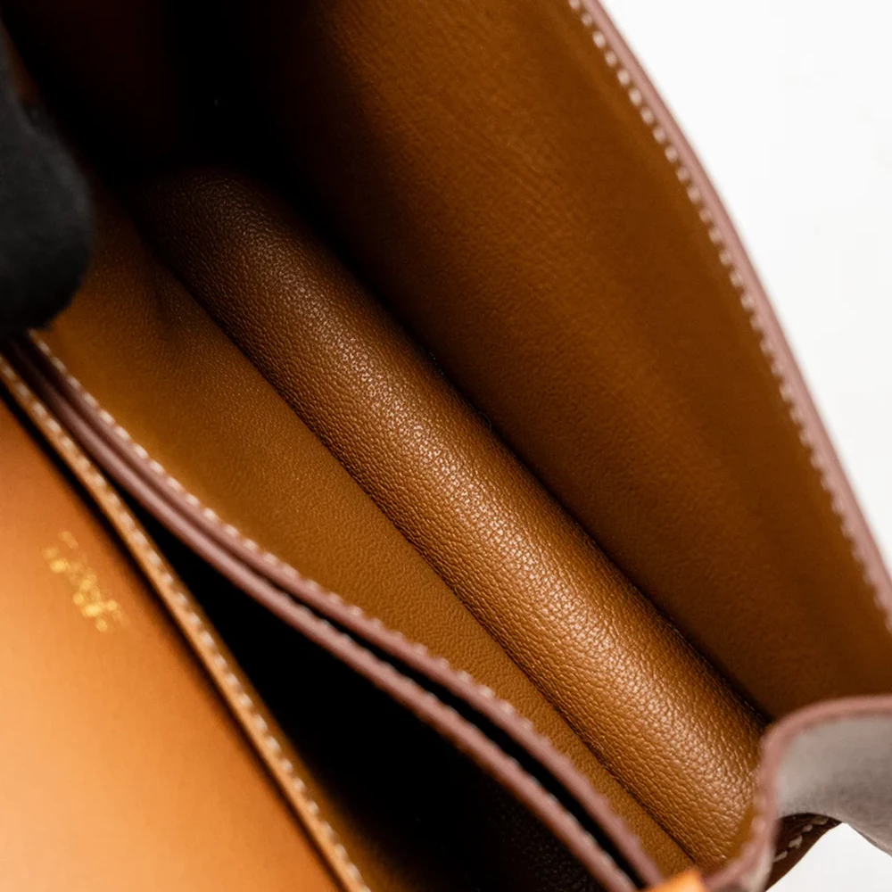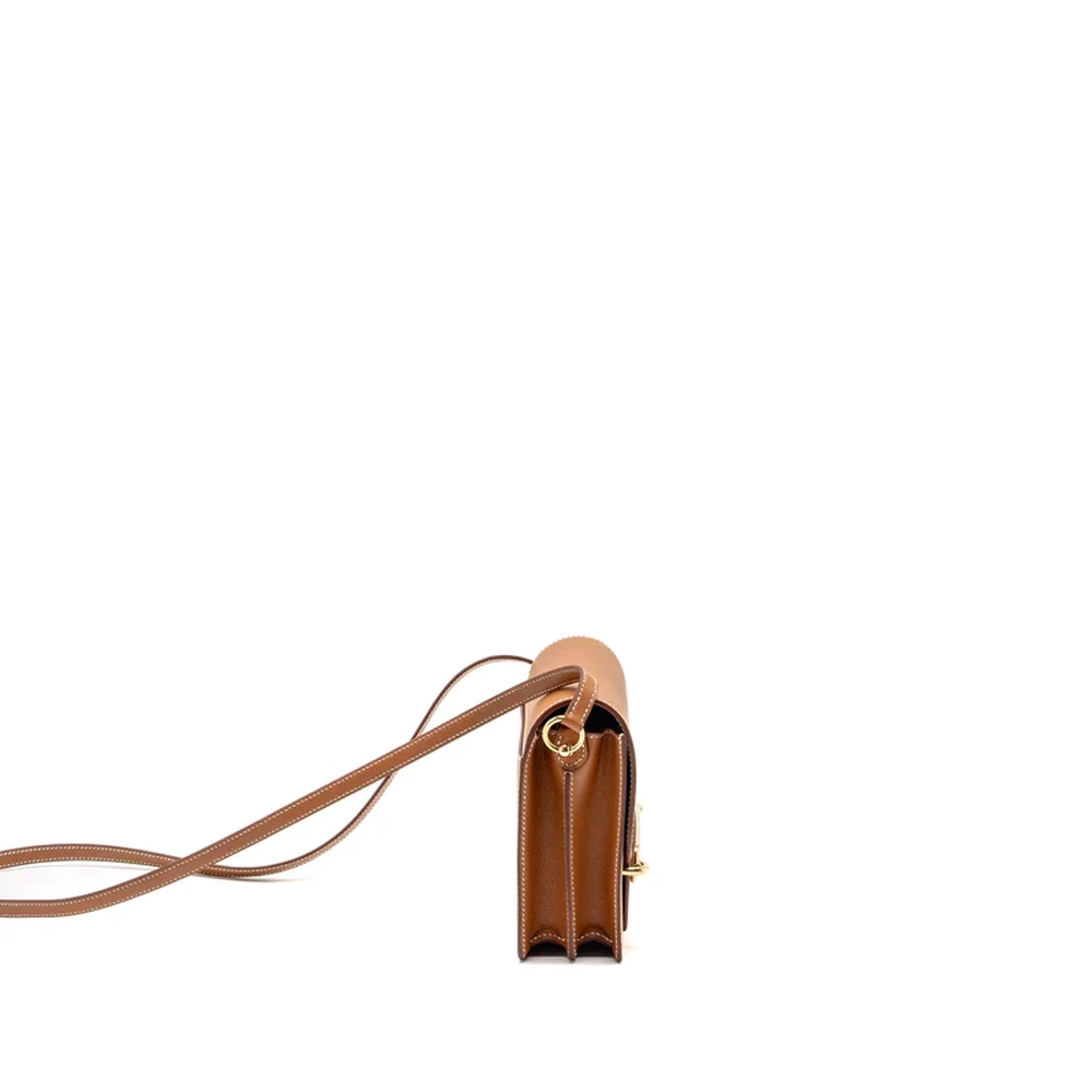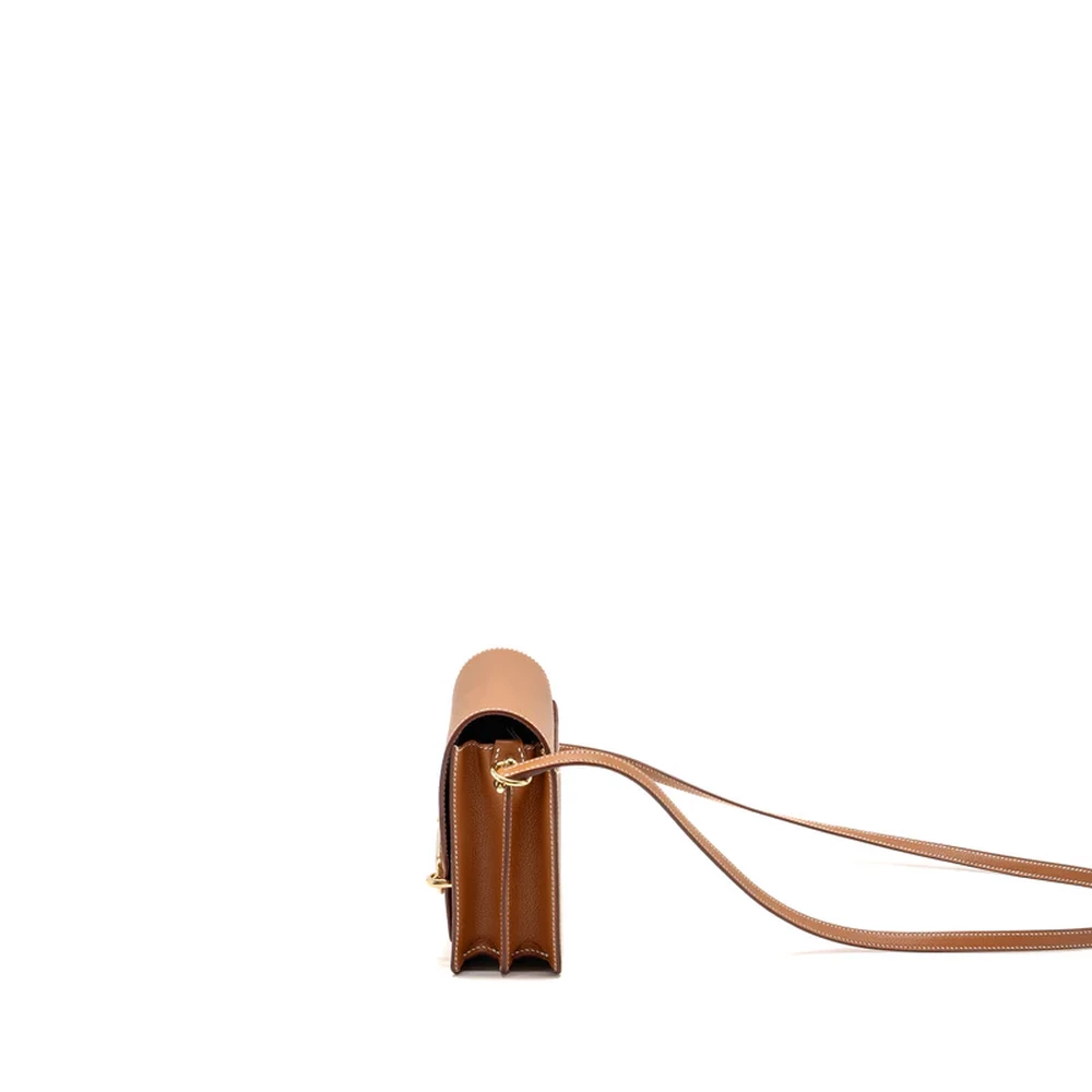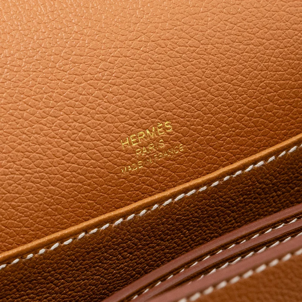 This Hermès Mini Roulis in Evercolor leather and Gold with silver hardware offers a sleek, refined look with a luxurious touch. The rich golden leather paired with the cool silver hardware creates a beautiful contrast, while the practical size and stylish design ensure it’s a versatile addition to any wardrobe.