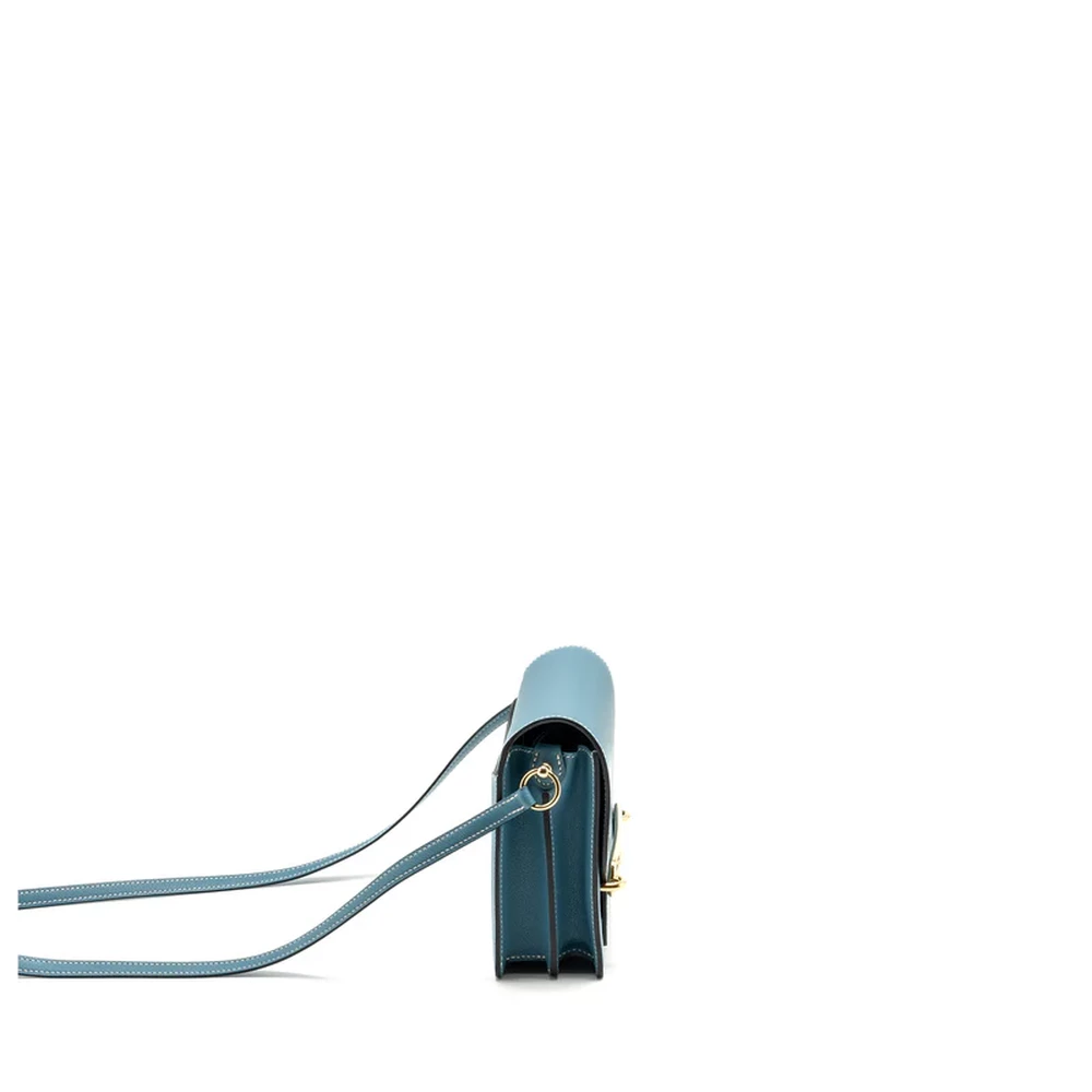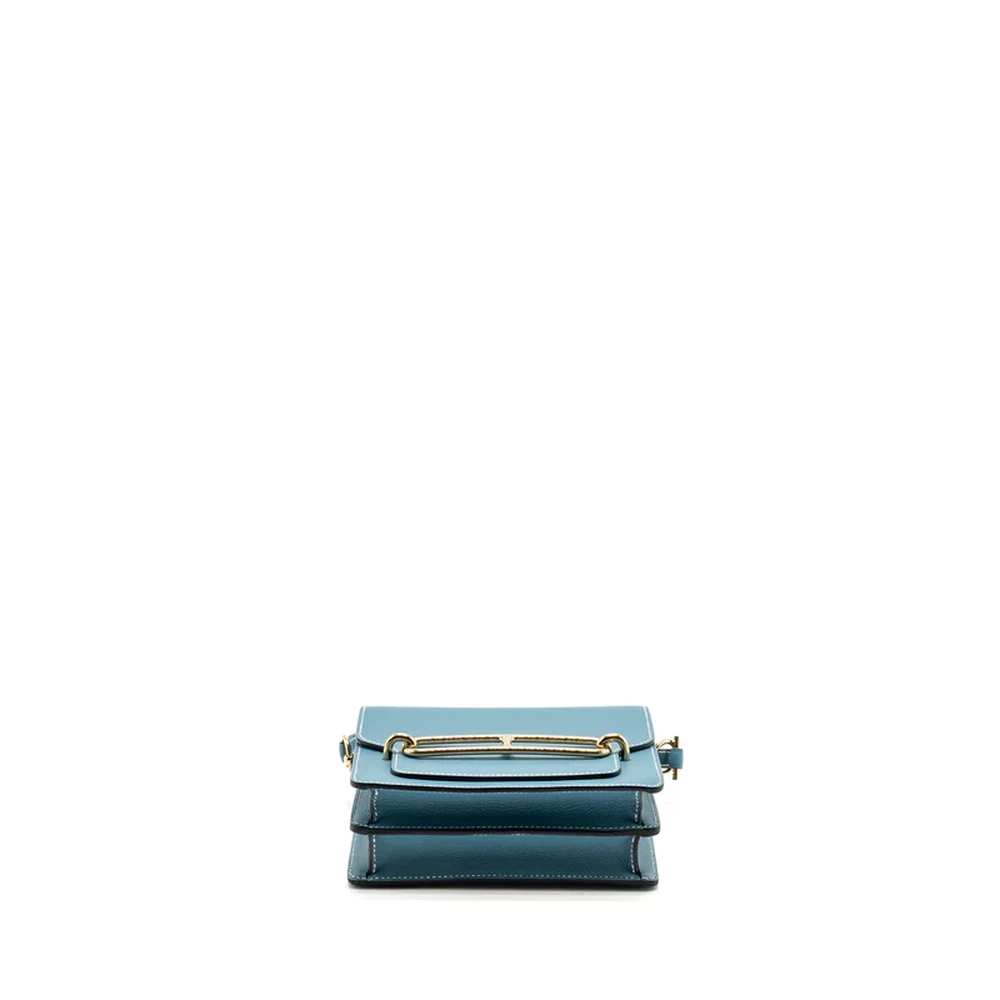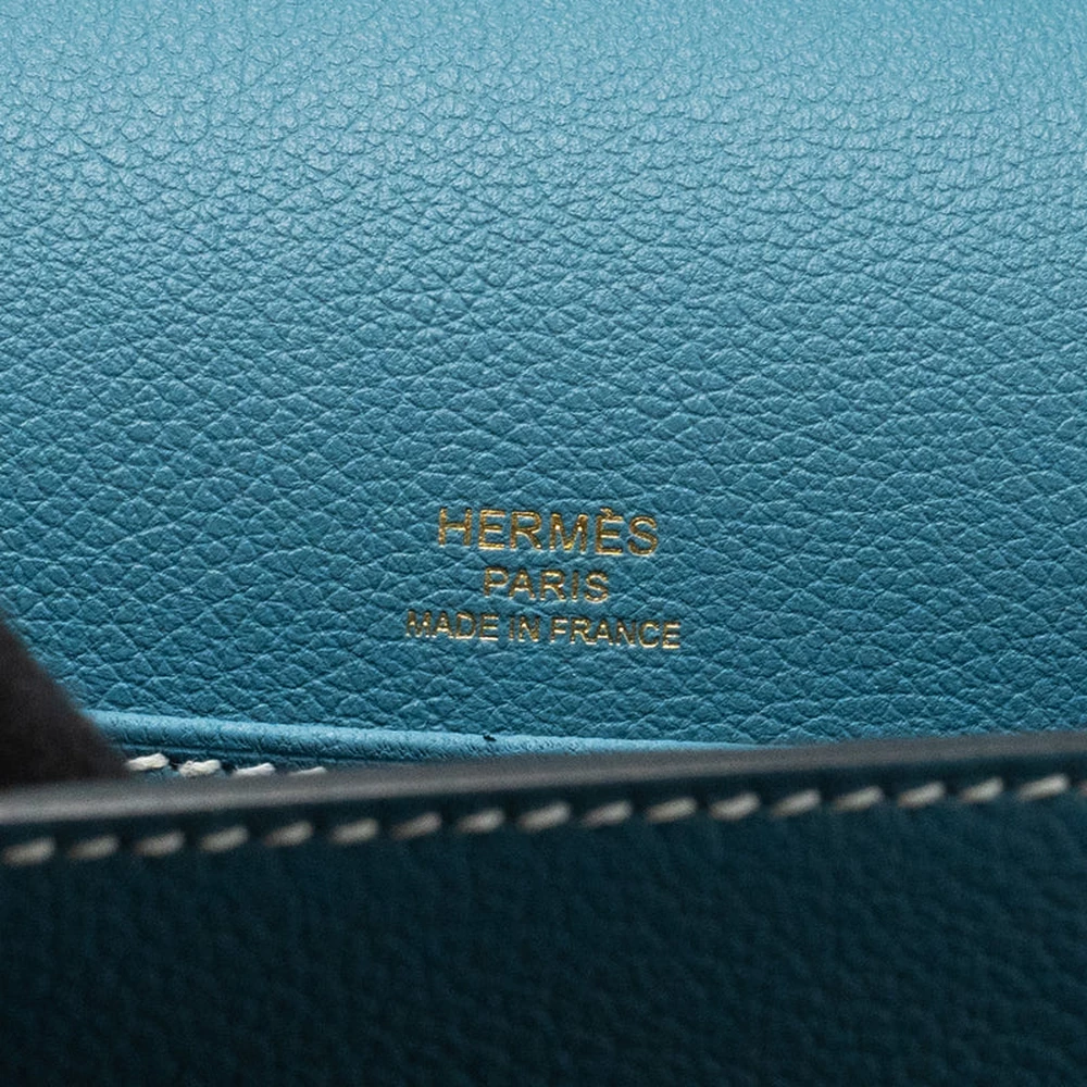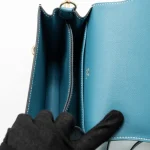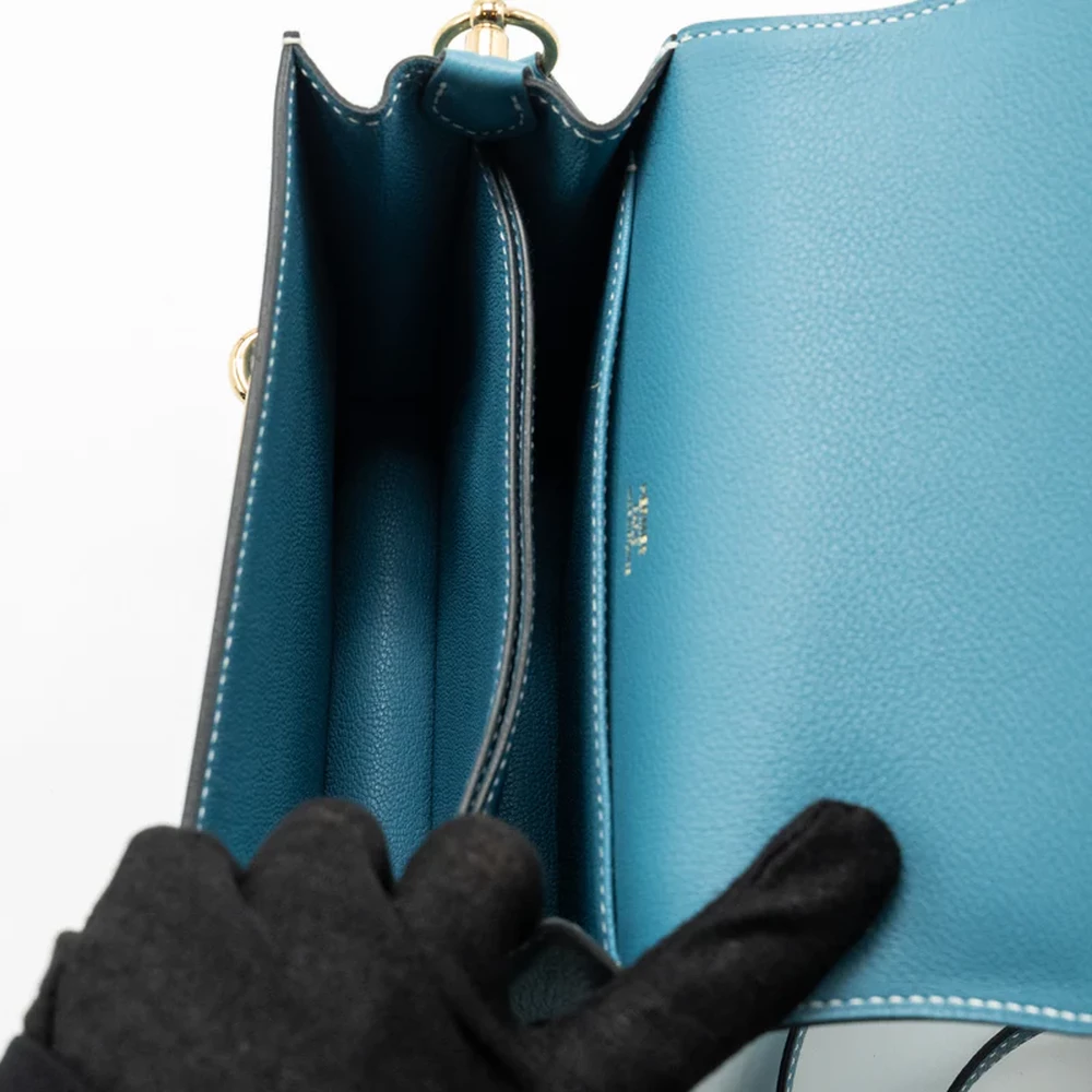 This Hermès Mini Roulis in Evercolor leather and New Bleu Jean with light gold hardware offers a refined yet contemporary design. The cool blue leather combined with the delicate light gold hardware gives this bag a modern, sophisticated vibe. The compact size and smooth design make it an ideal accessory for both casual and chic styling.