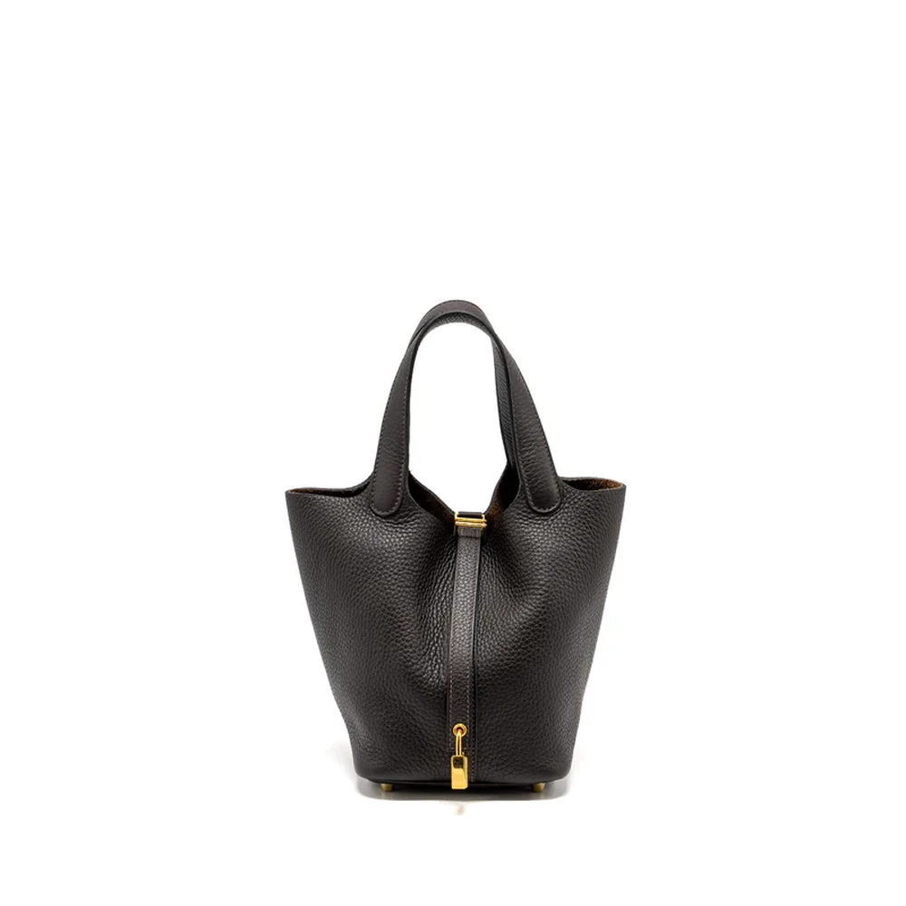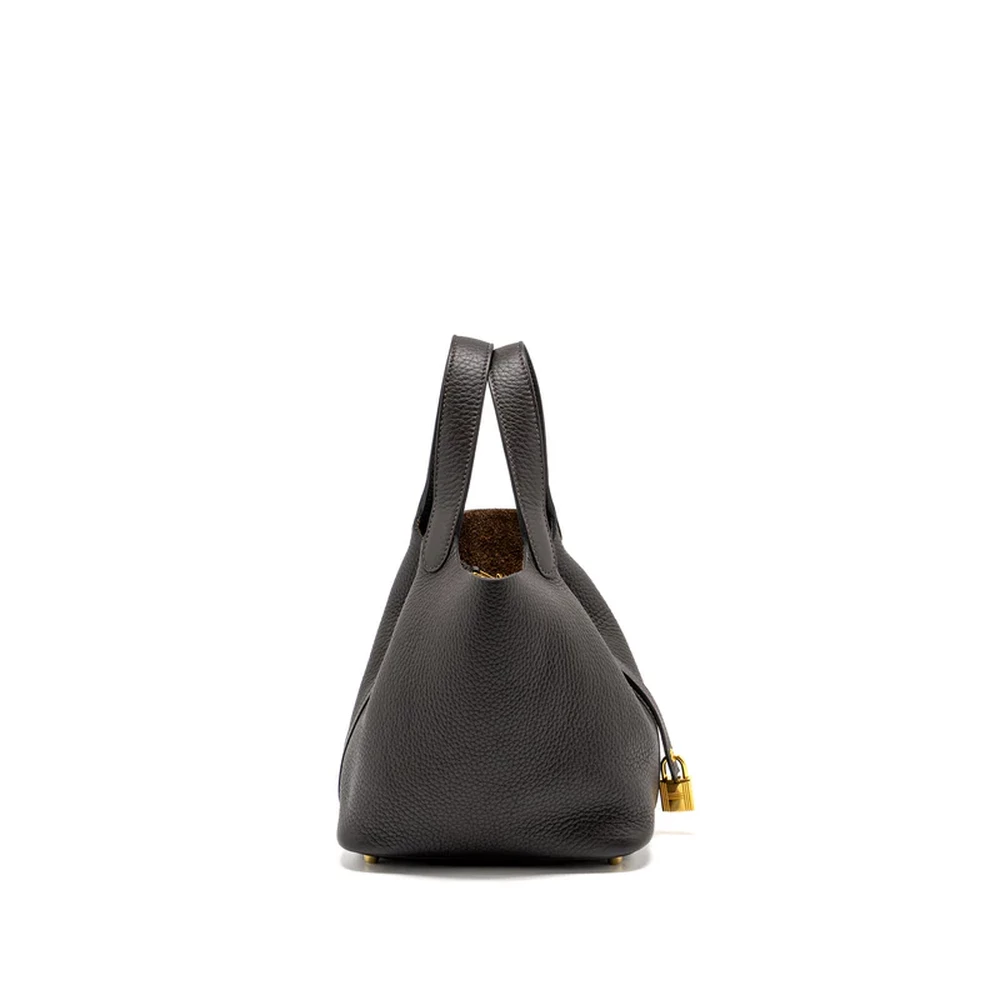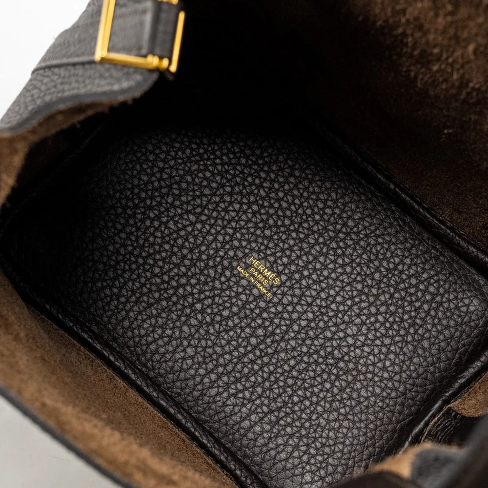 This Hermès Picotin 18 Lock Bag in Clemence leather in Ebene with Gold Hardware stamp Z is a luxurious and sophisticated design. The rich, deep Ebene color, paired with the soft Clemence leather, creates a timeless aesthetic. Gold hardware adds warmth, making it an elegant piece perfect for any occasion.