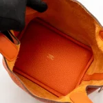 This Hermès Picotin 18 Lock Bag in Clemence leather in Orange with Gold Hardware stamp Z offers a bold and chic design. The bright Orange color, paired with the soft Clemence leather, creates a fun and stylish aesthetic, while the gold hardware adds a touch of luxury.