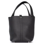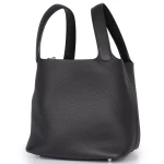 This Hermès Picotin 22 uses Noir (black) Togo leather for a casual, slouchy bucket shape. Palladium hardware adds subtle shine to the design. The 22cm size fits books, sunglasses, and daily essentials. Togo leather resists wear and stays soft. Style with denim or leather jackets for urban edge. Built for errands, travel, or everyday use. Effortless cool.