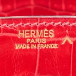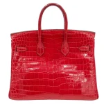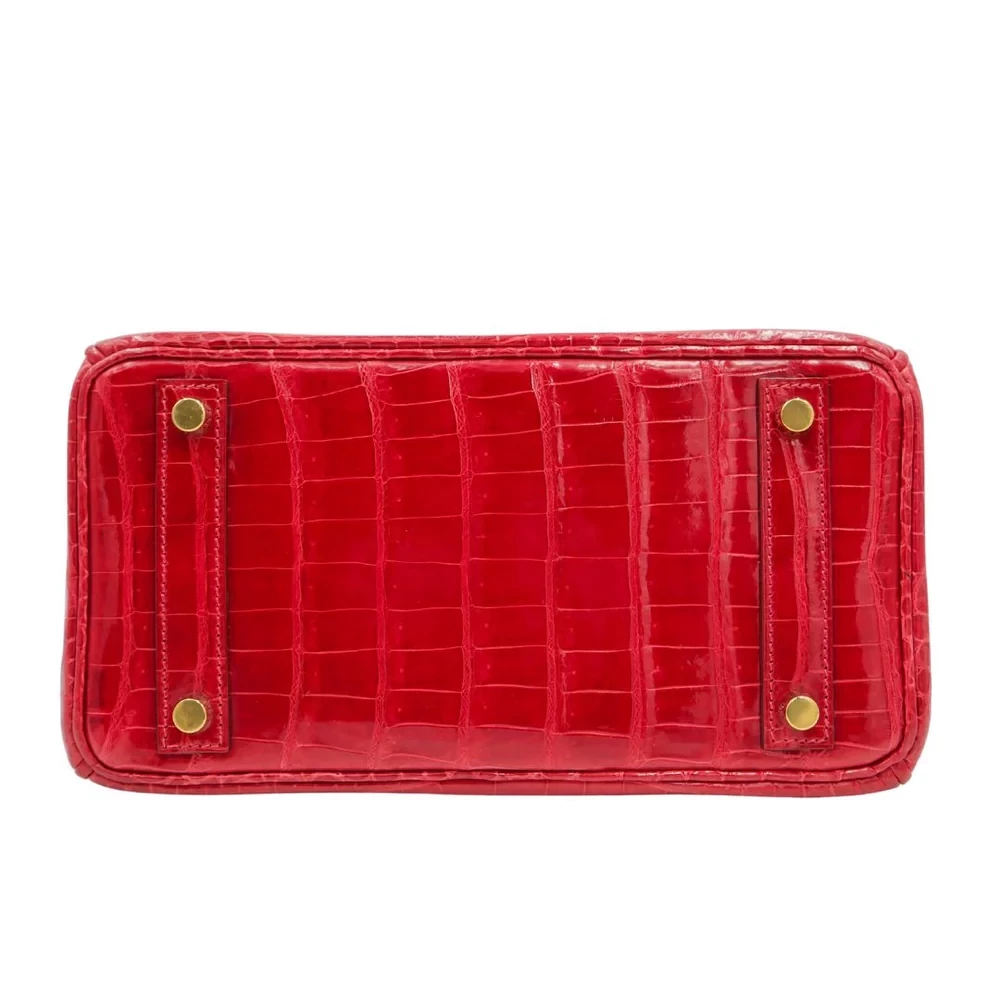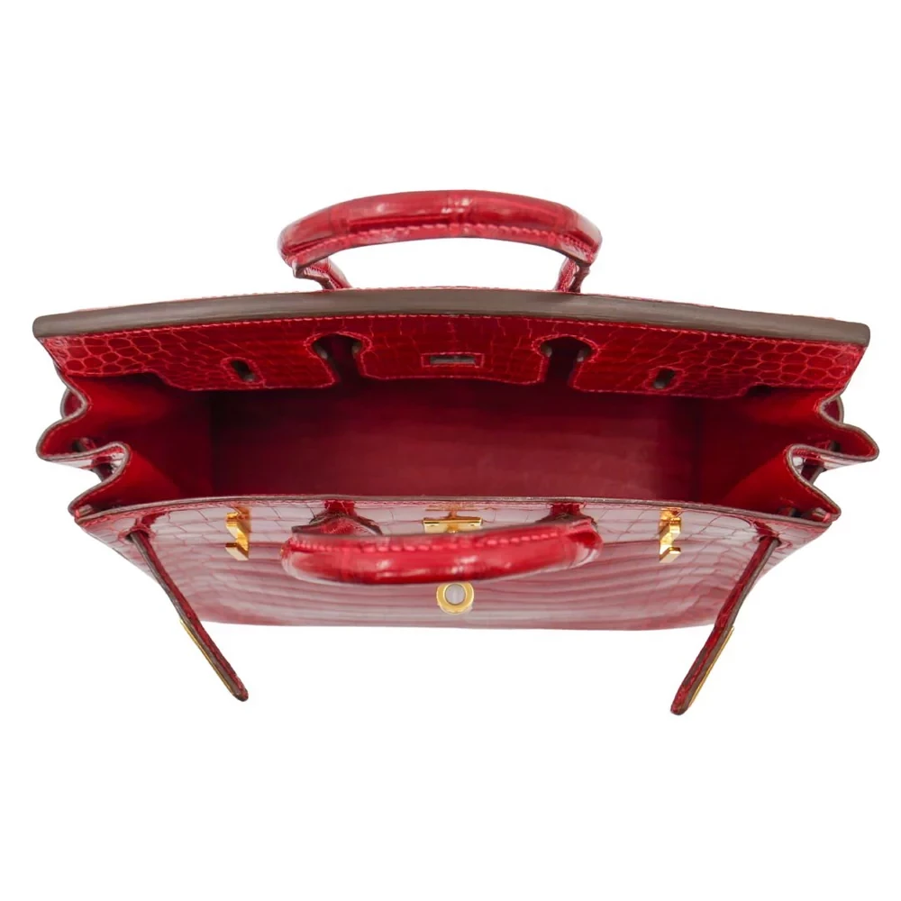This Hermès inspired Birkin 25 dazzles in Braise shiny Niloticus crocodile leather, a fiery red. Gold hardware amplifies the glossy 25cm design’s opulence. Scratch resistant crocodile stays flawless for years. Compact yet fits essentials like lipstick and cards. Pair with black for evening drama. A red carpet statement in miniature.