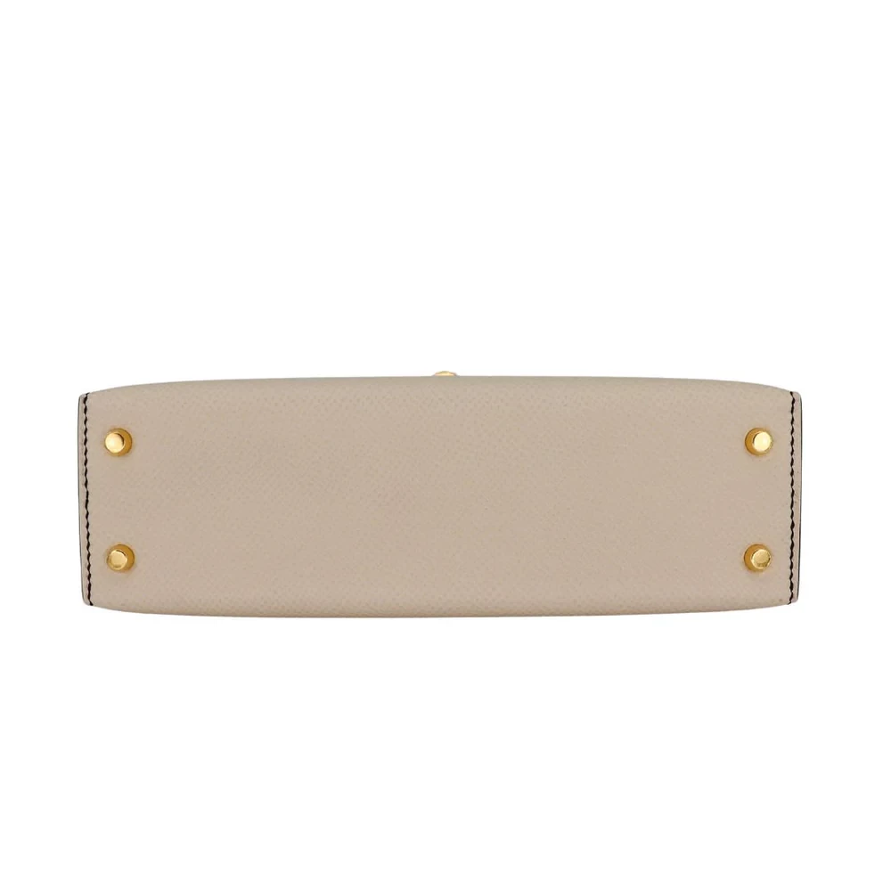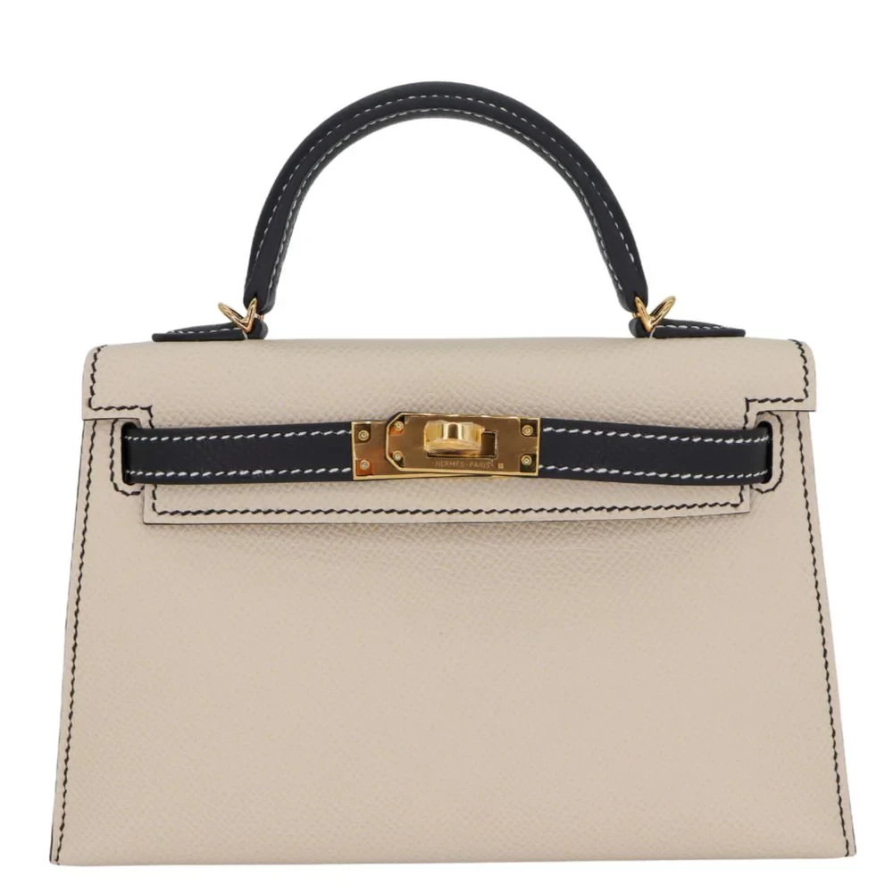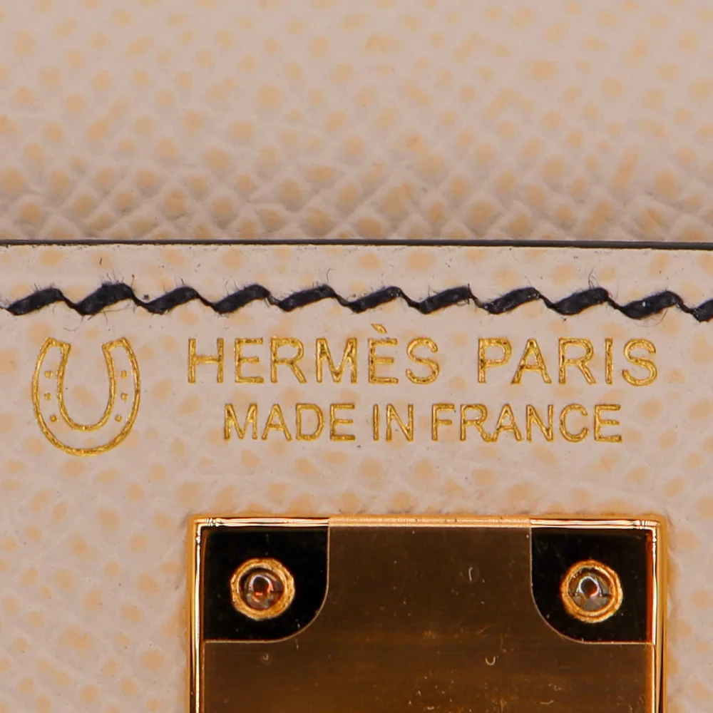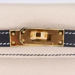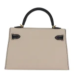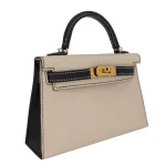 This Hermès inspired Kelly II Sellier Mini combines Nata and Black Epsom leather for sharp contrast. Gold hardware highlights the HSS panel and Sellier structure. The mini size fits cards, cash, and small essentials. Epsom leather stays scratch resistant and rigid. Pair with neutrals or bold prints for graphic impact. Perfect for modern offices, travel, or minimalist chic. Precision in every line.