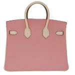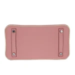 This Hermès inspired Birkin 25 mixes pink and cream Clemence leather. The brushed silver hardware keeps the look soft and subtle. The 25cm size is lightweight and easy to carry. The leather feels cozy against your arm, like a favorite sweater. It’s perfect for brunch dates or shopping trips. The gentle colors add warmth to any outfit. A bag that’s as sweet as a summer day.