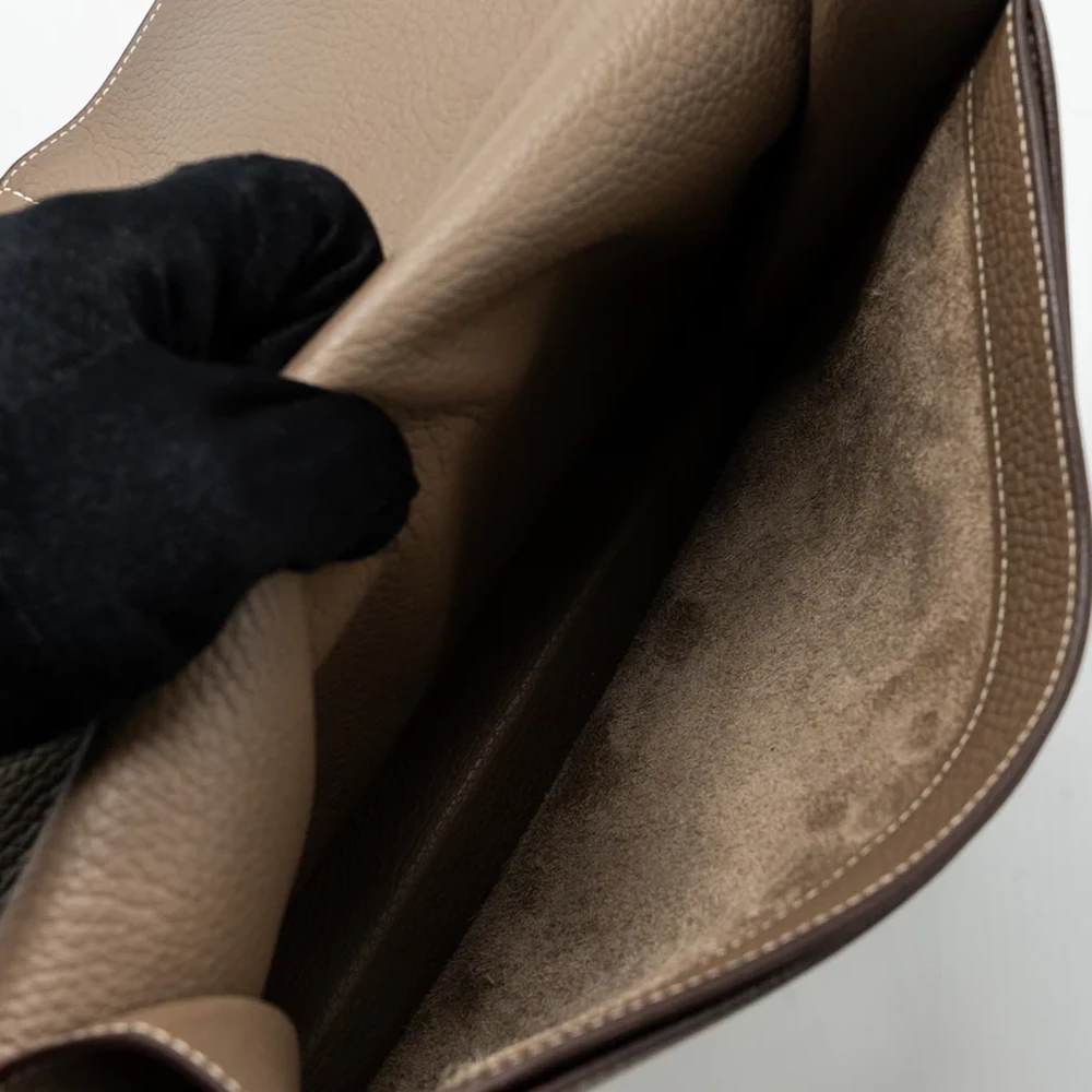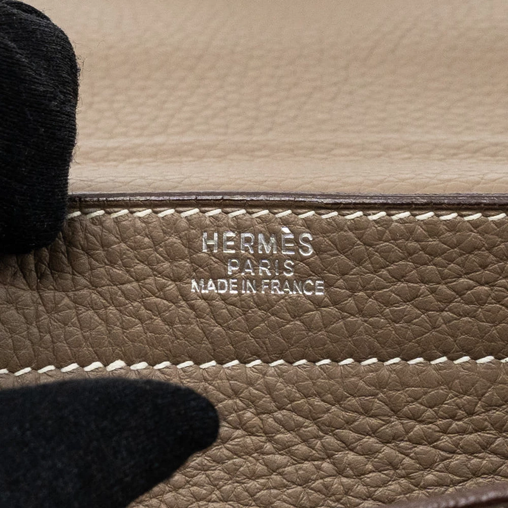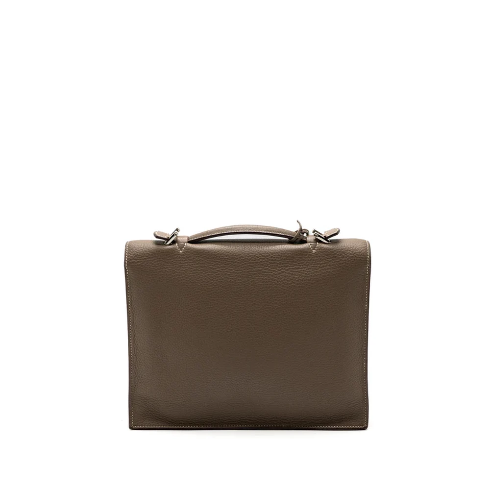 This Hermès Sac à Dépêches in Etoupe with Silver Hardware stamp Square J is a refined briefcase style bag that exudes understated luxury. The soft Etoupe color, combined with the durable leather, is complemented by sleek silver hardware, making it an ideal companion for both business and leisure.