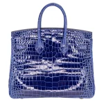 This Hermès style Birkin 25 dazzles in Bleu Saphir shiny Porosus crocodile leather, a deep sapphire blue. Gold hardware amplifies the glossy, jewel toned finish. The 25cm size fits essentials like cards and lipstick. Scratch resistant crocodile stays pristine. Pair with black or metallics for evening drama. A timeless treasure for bold elegance.