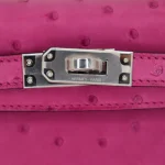 This Hermès Dupe Kelly Mini features Rose Poupre ostrich leather in deep pink. Palladium hardware complements the rich color. The mini size is perfect for evenings out. Exotic texture feels luxurious to touch. Pairs beautifully with black outfits. Your perfect date night companion. Romantic luxury for special moments.