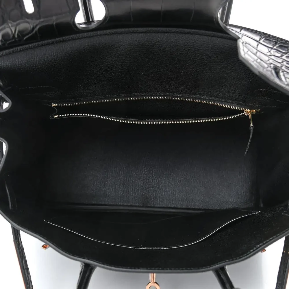 This Hermès inspired Birkin 30 Touch contrasts Black Togo leather with glossy alligator for edgy duality. Rose gold hardware softens the slouchy silhouette. The 30cm size holds gym gear, books, or travel kits. Togo and alligator resist wear and stay luxe. Pair with blush tones or neutrals for rebellious romance. Built for city nights or statement errands. Dark allure reimagined.
