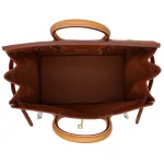This Hermès inspired HAC 40 combines Barenia, Vache, and alligator leathers. Electrum hardware unifies the rustic meets luxe patchwork. The 40cm design offers vintage charm with modern durability. Perfect for collectors appreciating artisanal craftsmanship. Pair with neutral tones to let textures shine. A wearable masterpiece for connoisseurs. Heritage luxury reimagined.